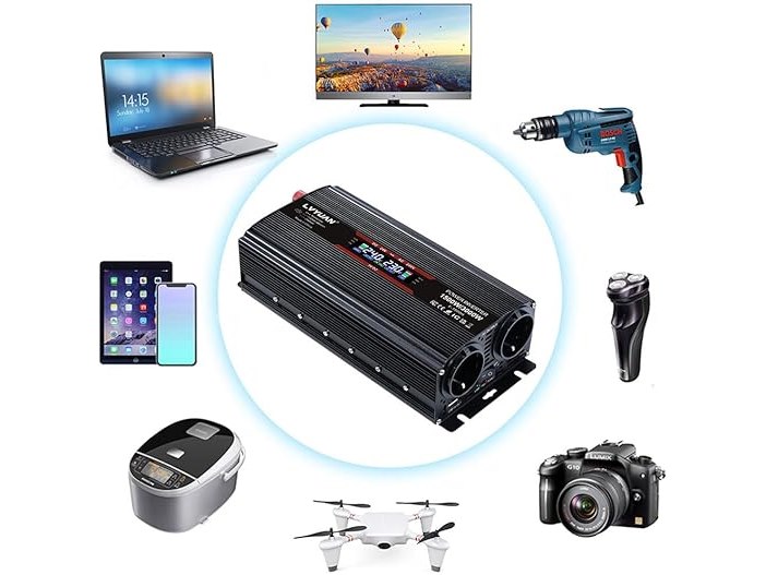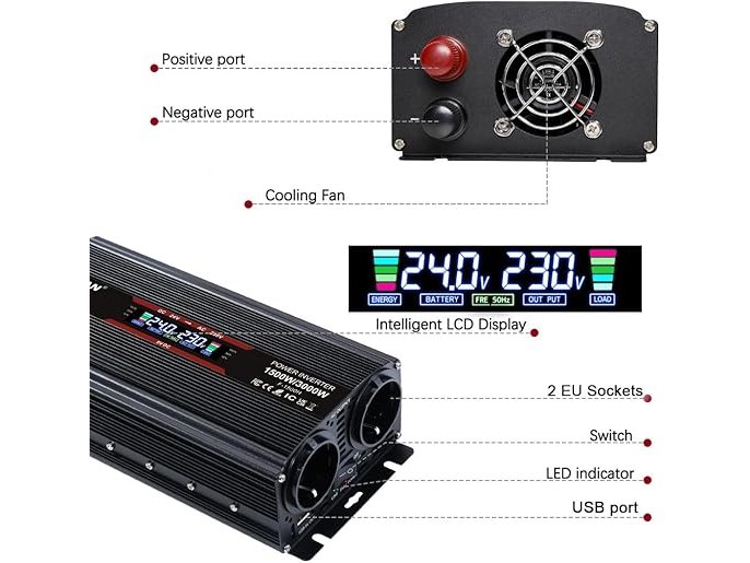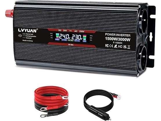 Minieme gebruikssporen, getest en werkend, volledig, ok, LVYUAN Spanningsomvormer, 24 V, 230 V, 1500 W/3000 W, omvormer, stroomomvormer met lcd-scherm, 2 EU stopcontact, ventilator en 5 V USB aansluitingen, incl. sigarettenaansteker, zwart, B095KDV8RV