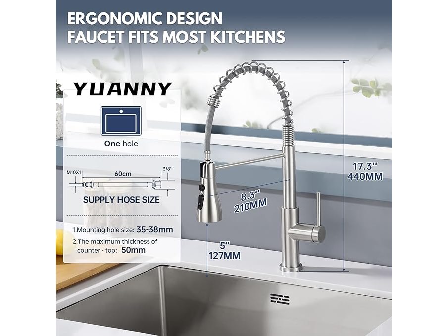 Ongebruikt, ok, Yuanny Waterkraan voor de keuken met sproeier, uittrekbaar, hogedruk keukenkraan, 360 graden draaibaar, mengkraan, spoelbakarmatuur, keukenkraan, spiraalveerkraan, roestvrij staal 304, geborsteld, B0C9J1YWNX