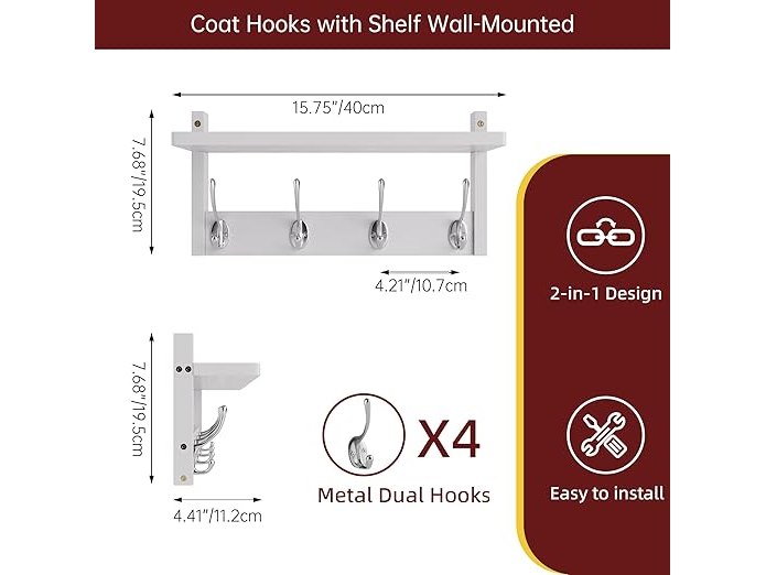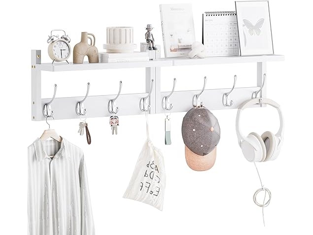 Ongebruikt, ok, verpakking ontbreekt, Stellstar Bamboe wandrek met 4 haken (2 stuks), hoedenplank, hangrek, 80cm, voor hal,voor hal Decor, Voor Het Opbergen van Kleding, Hondenriem (Wit+Zilver), B0DH82SR7D