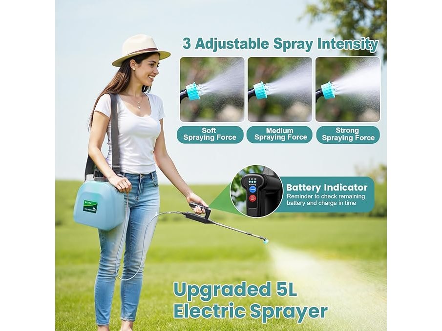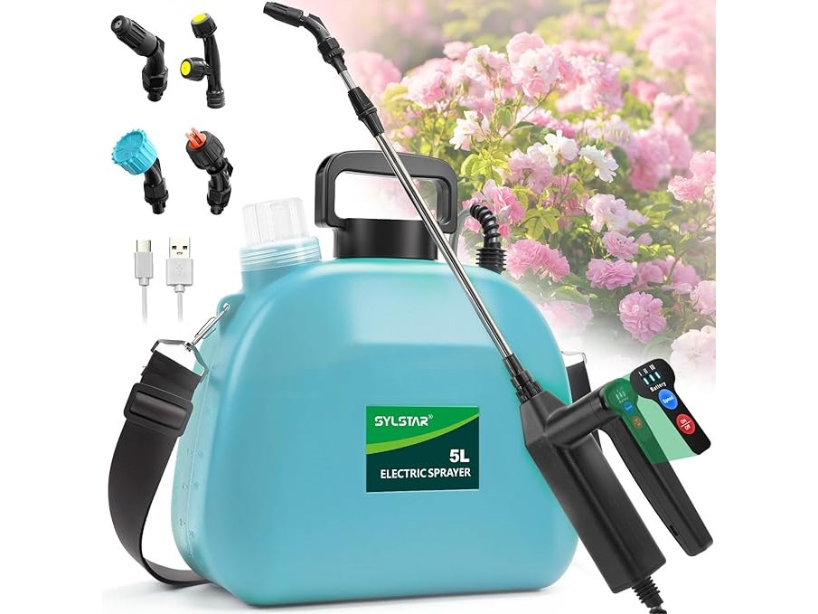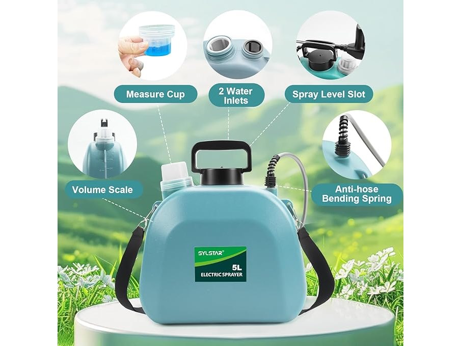 Minieme gebruikssporen, getest en werkend, volledig, ok, SYLSTAR Druksproeier 5L, Upgrade elektrische tuinspuit met 3 Nevelsproeiers, USB-Oplaadbaar Handvat en Telescoopstang, Elektrische Plantensproeier B0DYNMYC95