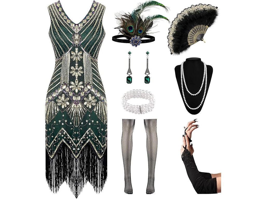 Ongeopend, ok, WILDPARTY Jaren 20-jurk voor dames, flapperjurk, kanten waaier, hoofdband, pailletten, kralen, franjes, jaren 20-accessoires, vintage maffia-kostuum,B0CZMNZ5ZV