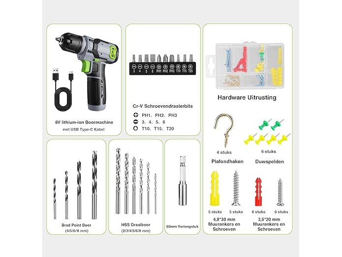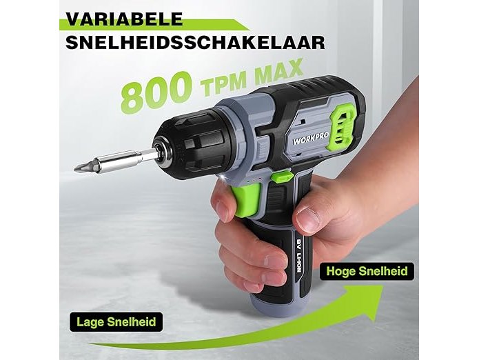 Ongebruikt, getest en werkend, volledig, ok, WORKPRO 8V Accuschroevendraaier set, Accuboormachine Met 3/8"(10mm) Boorhouder, 53-delige Accessoireset, Regelbare Snelheid, LED-lampje, Voor Thuisreparaties En Doe-het-zelven, B0CTZTD16F