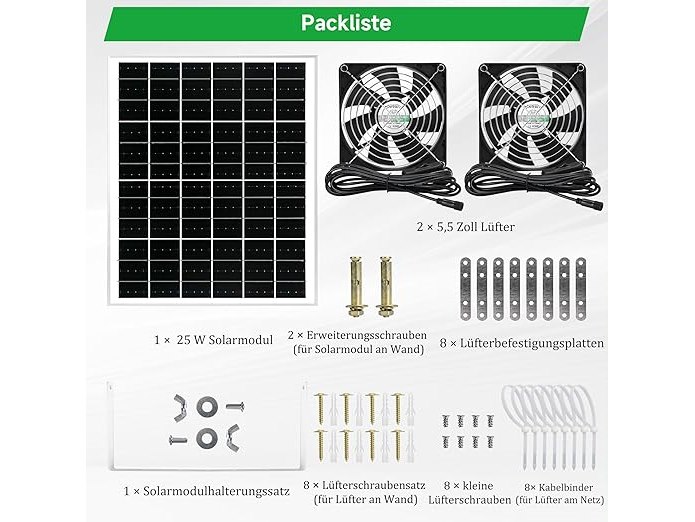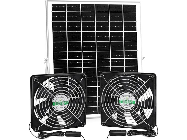 Ongebruikt, getest en werkend, volledig, ok, Blessny Ventilatorset op zonne-energie, 5,5 inch, 25 W zonnepaneel met 2 waterdichte ventilatoren voor kippenhokken buiten, broeikassen, schuren, toevoerlucht of afvoerlucht, met 4,5 m kabel, B0DSZY1KY7