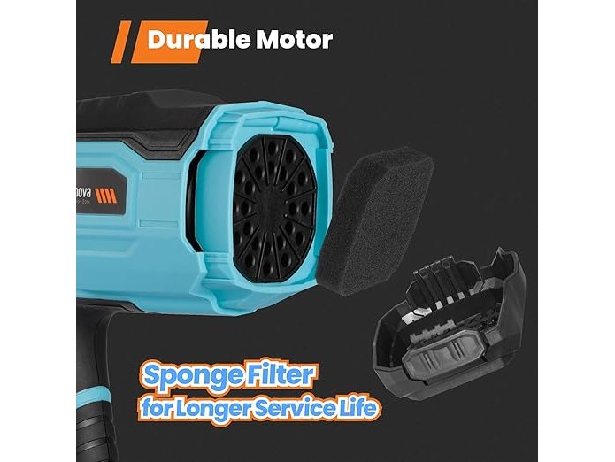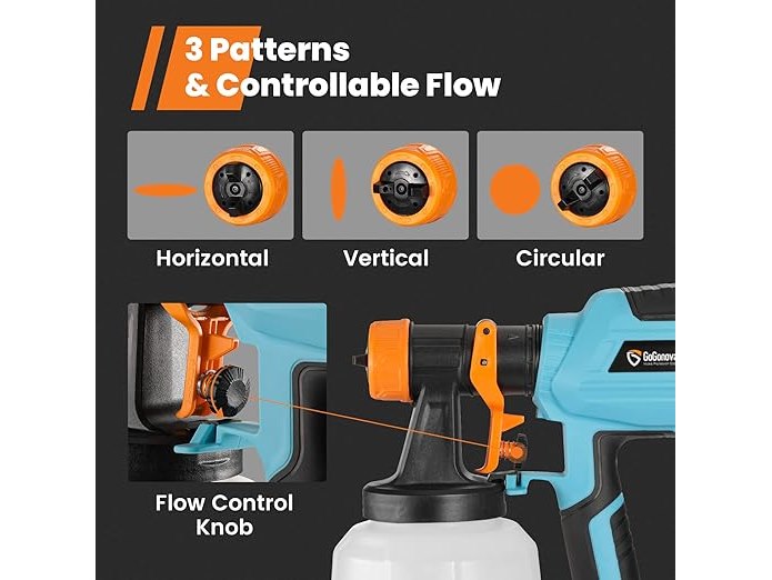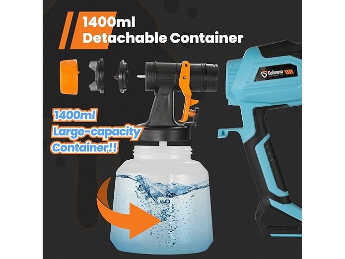 Gebruikssporen, getest en werkend, ok, verpakking ontbreekt, GoGonova Verfspuitsysteem, 1400 ml, grote container, lakpistool met 4 sproeiers, 3 patronen en filters voor lak, hek, leuningen en lazuurverf, blauw, B0B7W7L54R