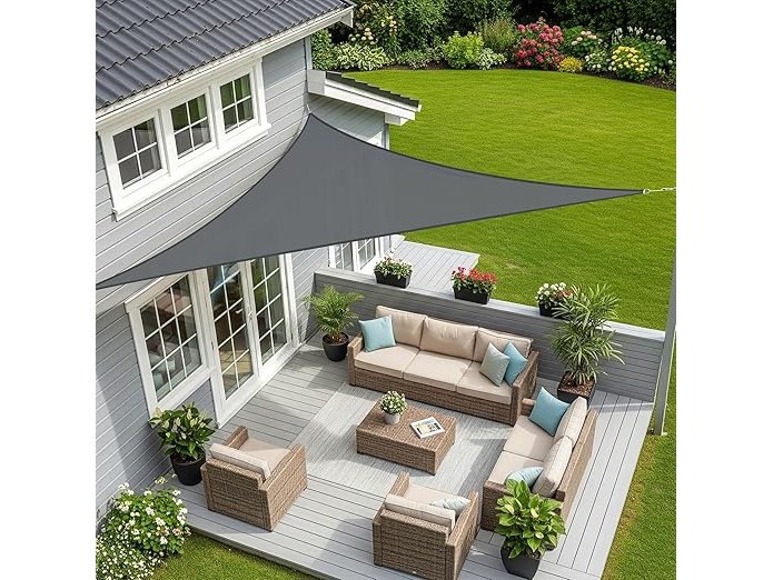 Minieme gebruikssporen, ok, Sunnylaxx 5 x 5 x 7 m, zonnezeil, driehoekig, waterdichte zonwering, zonnezeil, kleur antraciet, 95% uv-bescherming, B09P4QYPCC