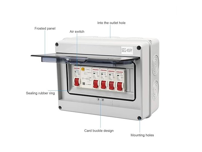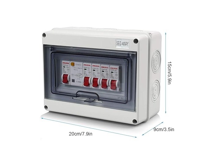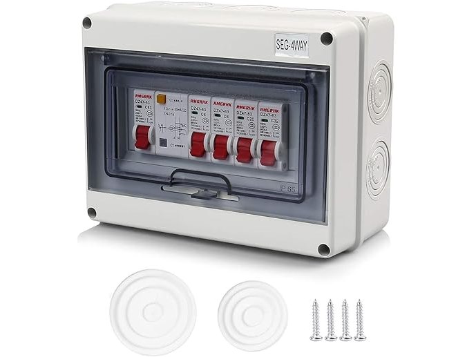 Ongeopend, ok, 4-weg stroomonderbrekerpaneel, IP65 lekstroomonderbrekerbox, beschermend, kunststof, 63 A, 30 mAh, RCD 4 MCB 2 x 6 A + 20 A + 32 A, B08P79Y7MW