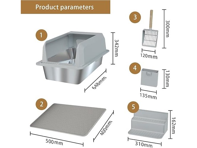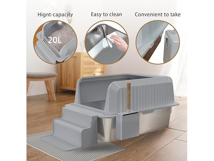 FREEUP Kattenbak XXL roestvrij staal grote hoge open rand met schep L D: H 60,5 x 40,5 x 30 cm grote kattenbak, antislip, mat, lekvrij, B0D25D52LK