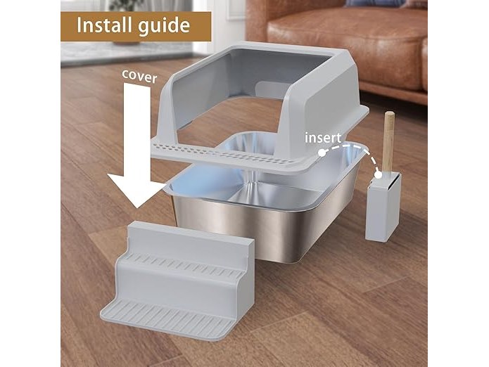 FREEUP Kattenbak XXL roestvrij staal grote hoge open rand met schep L D: H 60,5 x 40,5 x 30 cm grote kattenbak, antislip, mat, lekvrij, B0D25D52LK