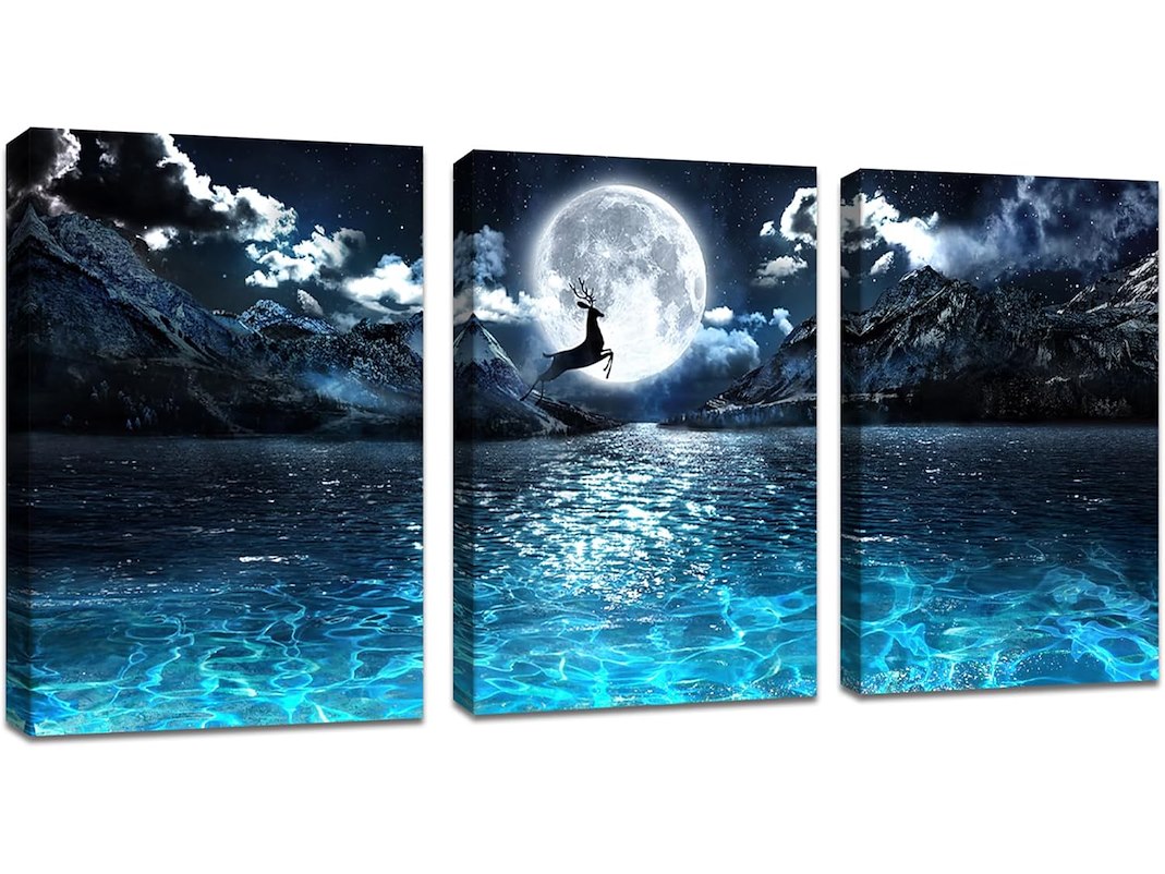Ongeopend in seal, 3 stuks canvasfoto's met lijst, lichte maan op blauwe oceaan, nachtfoto op canvas, klaar om op te hangen, 120 x 60 cm (40 x 60 x 3) B0CLXVYVWK