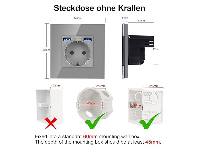 Ongeopend, ok, licht beschadigde verpakking, CnBingo Glazen schuko-contactdoos met USB-poorten 2,1 Amp totaal, design geaard stopcontact, enkel, met glazen frame, inbouwstopcontact, grijs, 4 stuks, B0BNN6SKPQ