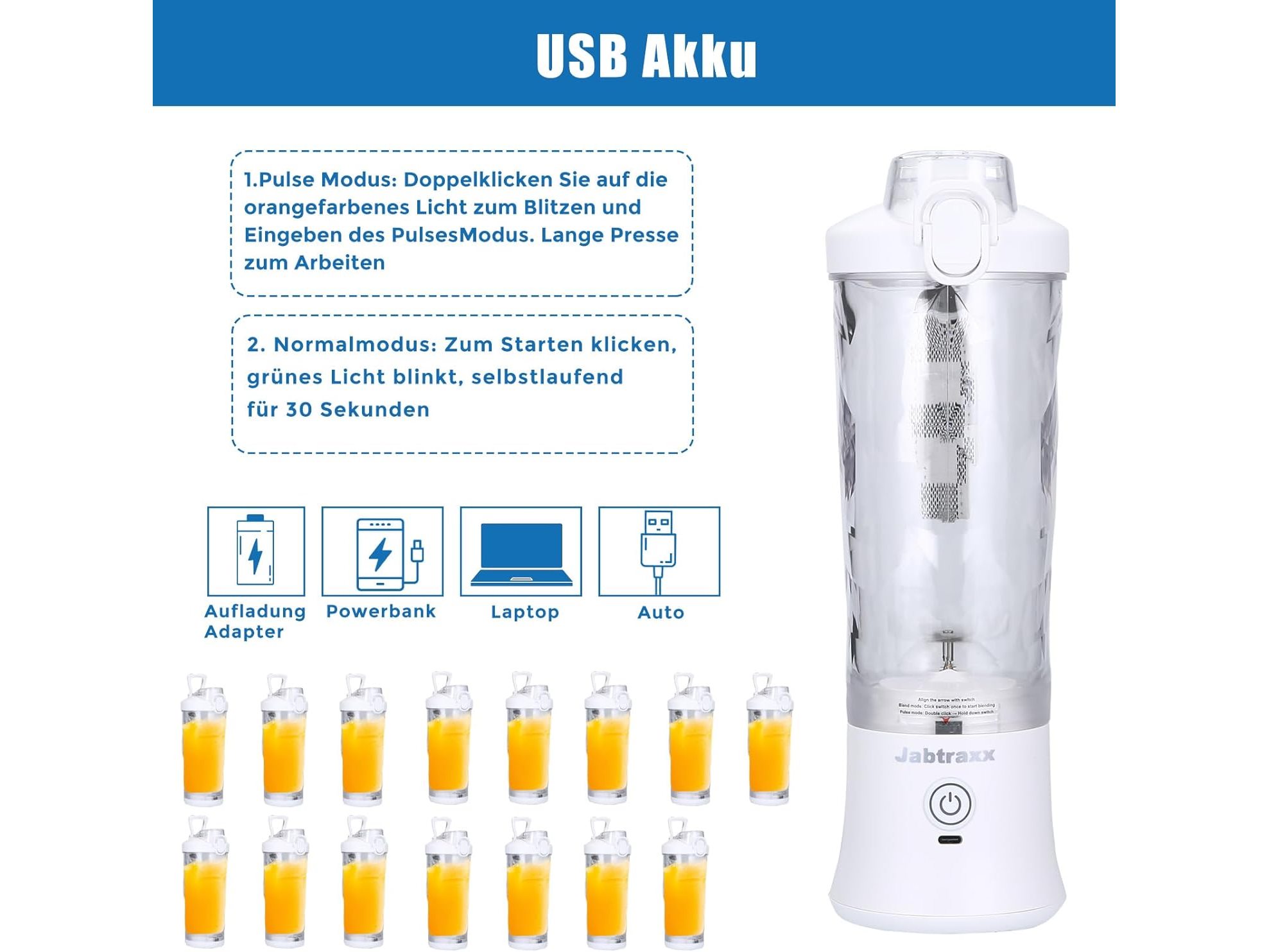 Ongeopend,Jabtraxx Draagbare 600 ml blender, mini-smoothiemixer, oplaadbaar, USB, sterke snijkracht met 6 ultrascherpe messen, wit, B0C4H8Y634