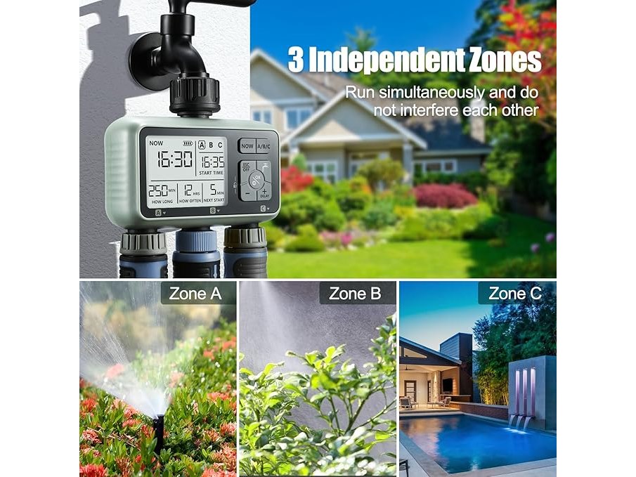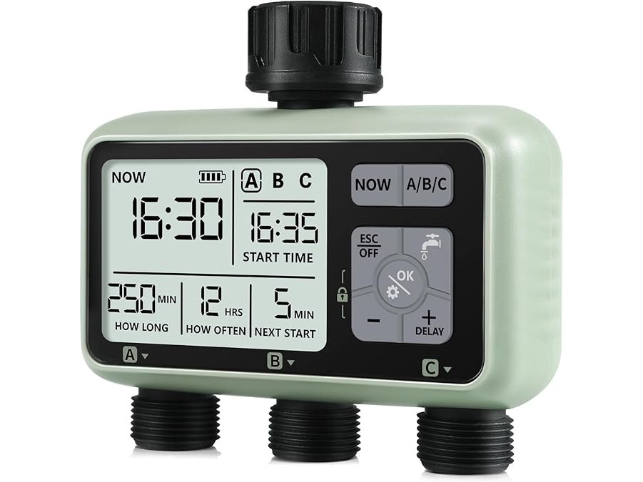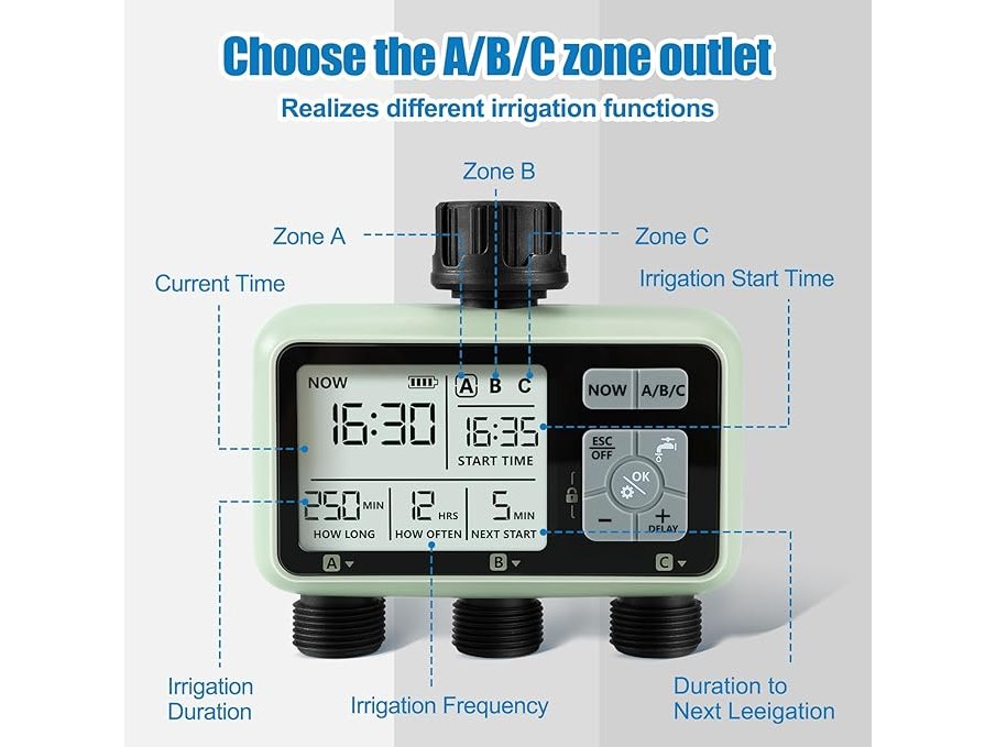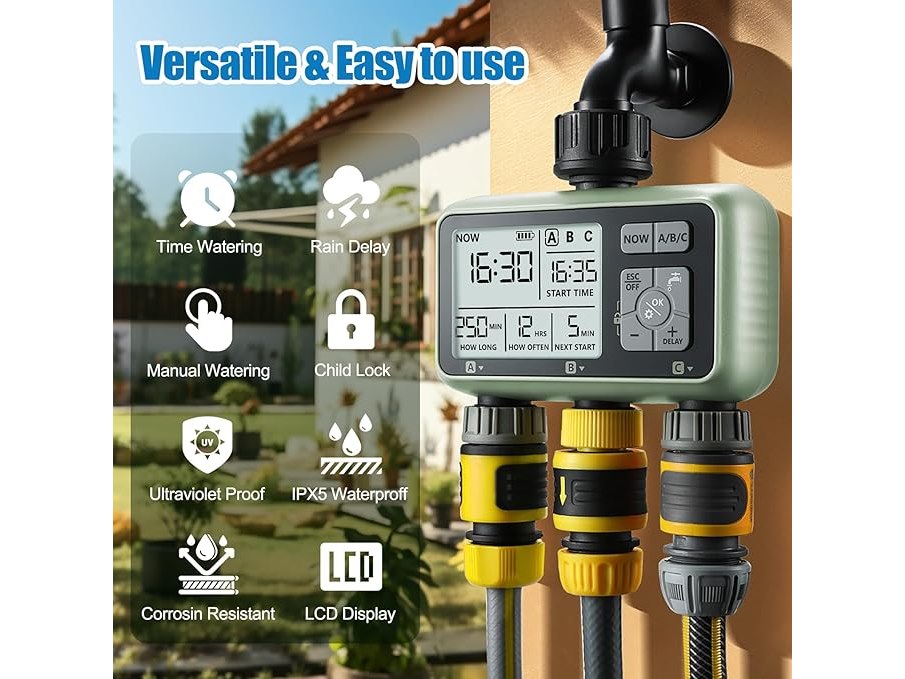 Ongebruikt, getest en werkend, CROSOFMI Irrigatiecomputer met 3 uitgangen, automatische tuinbewateringstimer, LCD-display, eenvoudige bediening, kindveilige functie, vertraagde bewatering bij hevige regenval en handmatige bewatering, B0CP2CGP8J