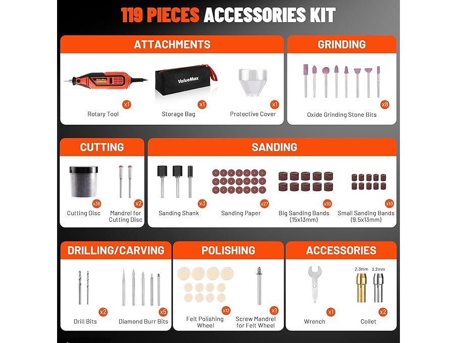 Lichte gebruikssporen, getest en werkend, compleet, ValueMax Mini Multifunctioneel Gereedschap 130W, Roterend Gereedschap met 120 Accessoires, 5 Variabele Snelheidsinstellingen 35000 tpm, voor Slijpen, Snijden, Boren, Polijsten, B0CC1YT1HL