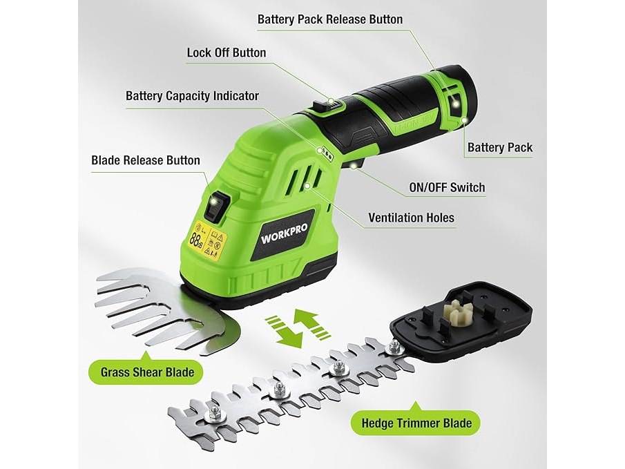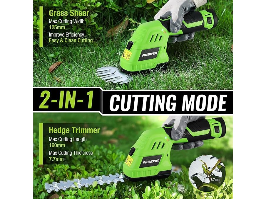 Ongebruikt, getest en werkend, WORKPRO 12V Heggenschaar op Accu, 2-in-1, Groen, Handige Grasschaar met 2 Messen, 2 Ah Accu en Oplader, Elektrische Heggenschaar, Grastrimmer voor Tuinieren, Snijbreedte 12,5 cm, B0CF4Z3NVW