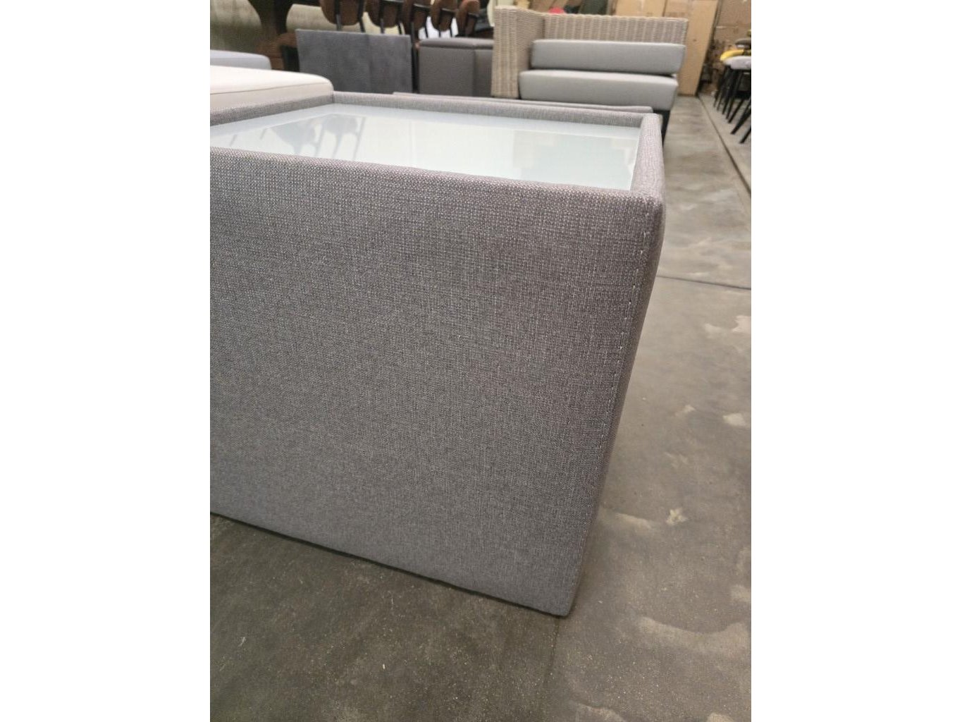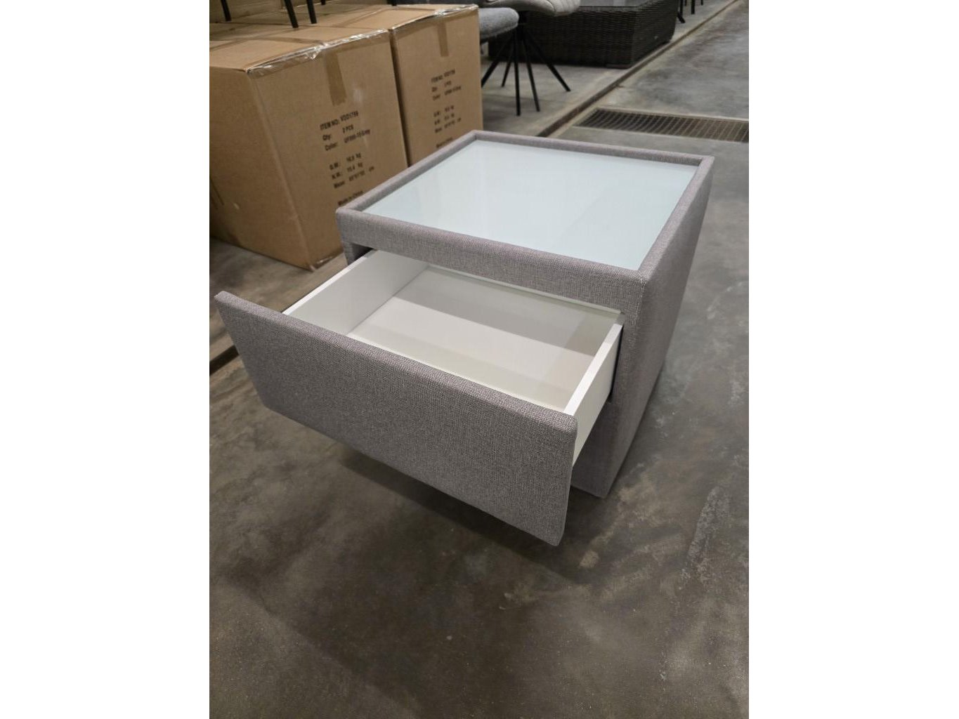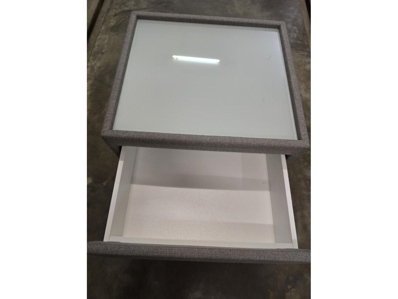 1x nachtkastje in stof met lade en glasblad 50x50x46h