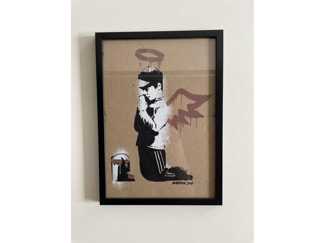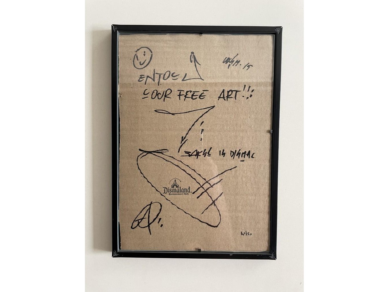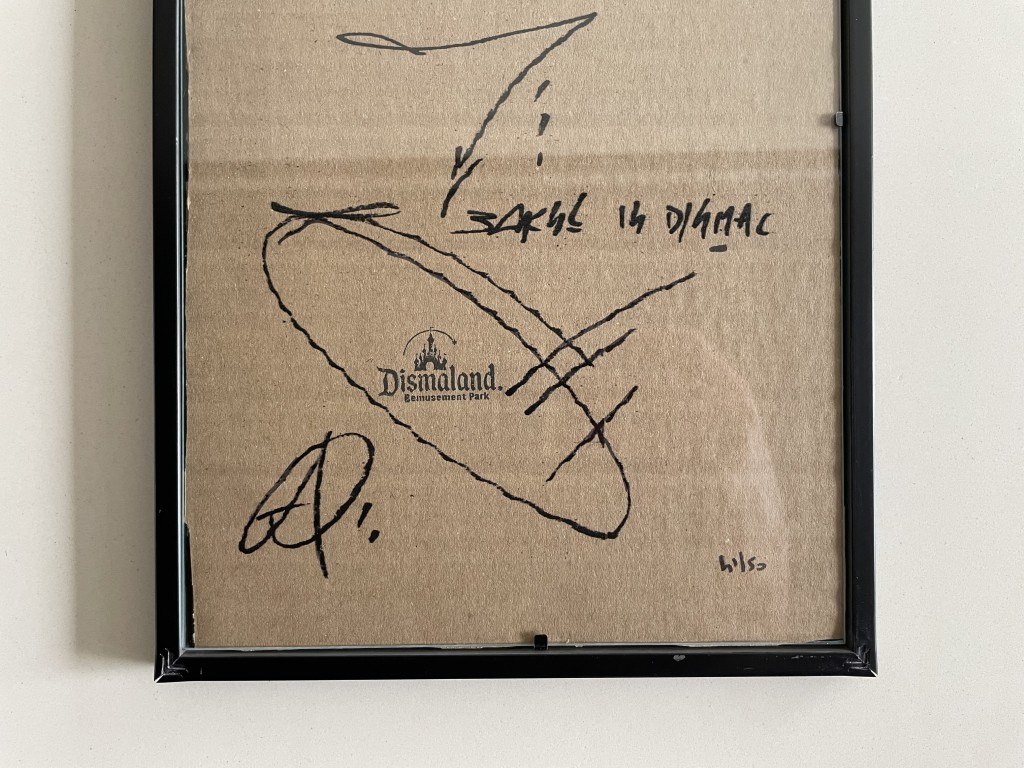 (After)<br /> Ingekaderd karton dat waarschijnlijk uit het park komt van Dismaland (in 2015)<br /> Afmeting werk : 20x30cm<br /> Limited édition : 50 stuks<br /> Genummerd : 41/50<br /> Ingekaderd dubbelzijdig<br /> Perfecte staat<br /> Zonder Certificaat <br /> Het is waarschijnlijk ondertekend door de organisatoren van het park.<br /> Ter info : Voor de werken van Dismaland of het Walled Off Hotel zijn er geen echtheidscertificaten uitgeschreven.<br /> En pest control levert geen documenten af.