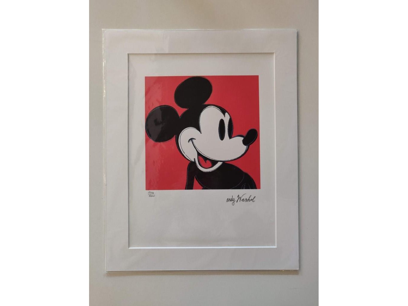 (After)<br /> Micky Mouse ROOD<br /> Lithografie getekend in de plaat.<br /> Genummerd in potlood : 3304/5000<br /> Afmeting lithografie : 36 x 43 cm<br /> Met passe partout<br /> Afmeting met passe partout : 40 x 50 cm<br /> Achteraan stempel : CMOA <br /> Perfecte staat<br /> Zonder Certificaat