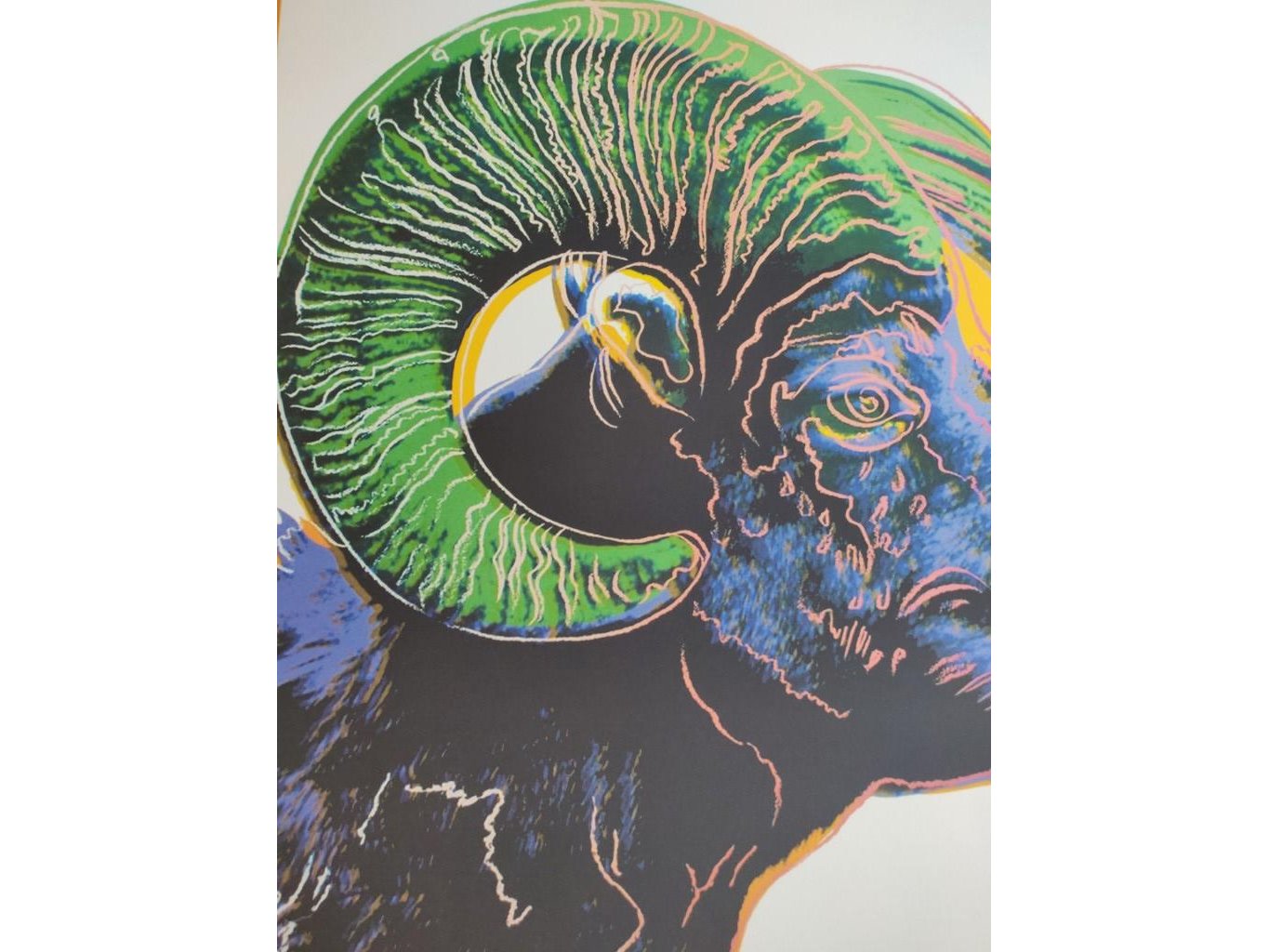 (After)<br /> Serie : Endangered species<br /> RAM<br /> Datum : 1983<br /> Techniek : Zeefdruk in kleur op Lenox Museumbord<br /> Afmeting werk : 96,5x96,5cm<br /> Proefdruk : Niet genummerd en niet getekend<br /> Uitgegeven door Ronald Feldman,Fine Arts Inc, New York<br /> Rode inktstempel op achterzijde : Andy Warhol 1983<br /> Publisher Ronald Feldman<br /> Fine Arts.Inc. New York<br /> Blinddrukstempel van drukker Rupert Jasen Smith (New York) in linker beneden hoek.<br /> Dit werk is afgeleid van de originele versie.Kleine gebreken rechtvaardigen dat het om een proefdruk gaat.<br /> Niet ingekaderd<br /> Perfecte staat