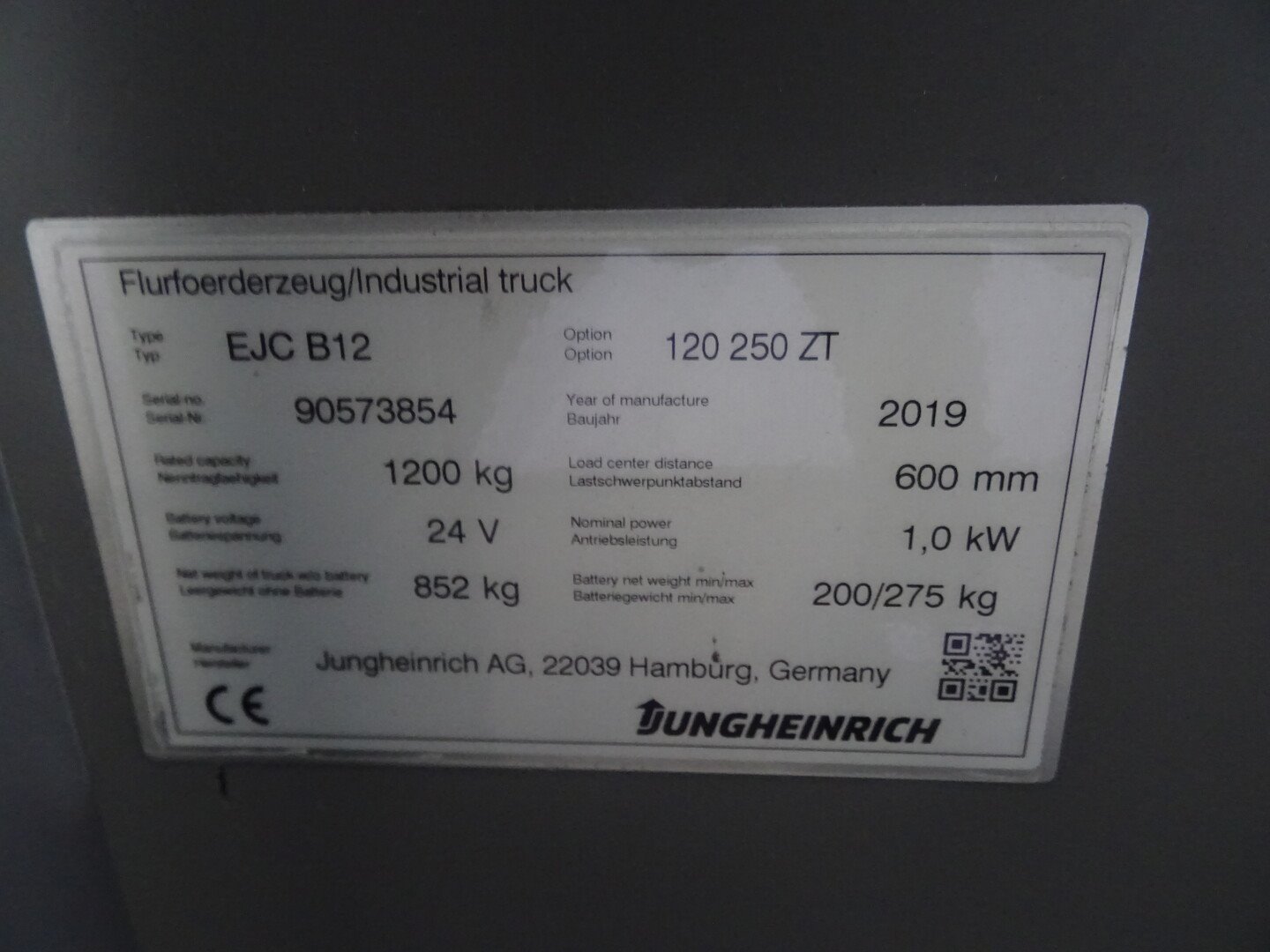 Type: EJC B12, draagvermogen 1,2t, bj: 2019, max 2,5m, laden op 220v via stopcontact<br /> Locatie: zone 9