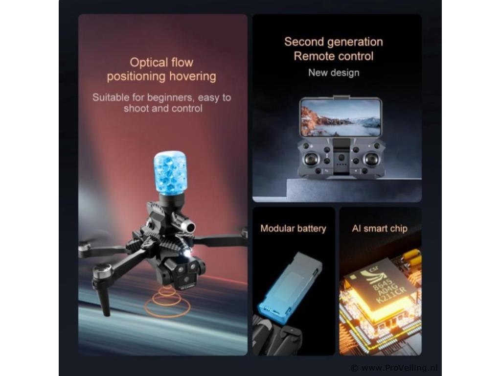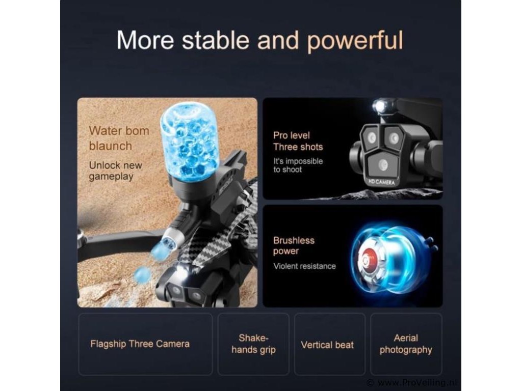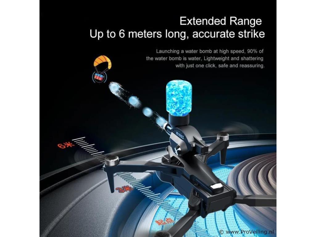 RTF (Ready to Fly) De Schiet Drone 8K is direct klaar voor gebruik. Het enige wat nog nodig is, zijn batterijen voor de zender. Ontwerp en bouw Met een gewicht van slechts 178 gram biedt de Schiet Drone een lichtgewicht ontwerp dat duurzaamheid combineert met draagbaarheid. Deze drone, nauwkeurig vervaardigd in China, heeft een slank en modern frame waarin de nieuwste technologie is verwerkt, perfect voor een spannende vliegervaring. Luchtfotografie De Schiet Drone legt indrukwekkende luchtbeelden vast dankzij de 4K-videoresolutie (4096x2160). De opnameopties in zowel 1080p HD als 4K HD bieden een breed scala aan mogelijkheden, of je nu het landschap vastlegt of luchtavonturen beleeft. Waterbomlanceringsfunctie Een opvallend kenmerk van de Schiet Drone is de unieke waterbomlanceerfunctie. Deze wereldprimeur in drone-speelgoed biedt zowel single-shot- als continu-shot-modus, waarmee gebruikers op precieze wijze luchtgevechten met waterbommen kunnen voeren. Dit voegt een extra laag spanning en interactie toe aan buitenspeelplezier. Vluchtprestaties Met een maximale windsnelheidsweerstand van minder dan 10 km/u en een vliegtijd van 15 minuten biedt de Schiet Drone een stabiele en plezierige vliegervaring. De drone is uitgerust met een 6-assige gyroscoop en een volledig omnidirectioneel detectiesysteem voor soepele en responsieve besturing. Connectiviteit en controle De Schiet Drone biedt veelzijdige bedieningsmogelijkheden, waaronder bediening via een app, afstandsbediening en Wi-Fi-verbinding. De waterbomlanceerfunctie, borstelloze motoren en optische stroompositionering dragen bij aan een dynamische en boeiende vliegervaring. Camerastabilisatie en beeldkwaliteit Voor vloeiende en heldere beelden is de drone uitgerust met een gimbal-stabilisator. De 1/6,0-inch sensor met meer dan 6 miljoen pixels zorgt voor luchtfotografie van hoge kwaliteit. De elektrische lens in combinatie met de 4K HD-opslag levert indrukwekkende beeldresultaten. Specificaties: GPS: Ja Maximale videokwaliteit: 4K (4096x2160 pixels) Maximale windsnelheidsweerstand: