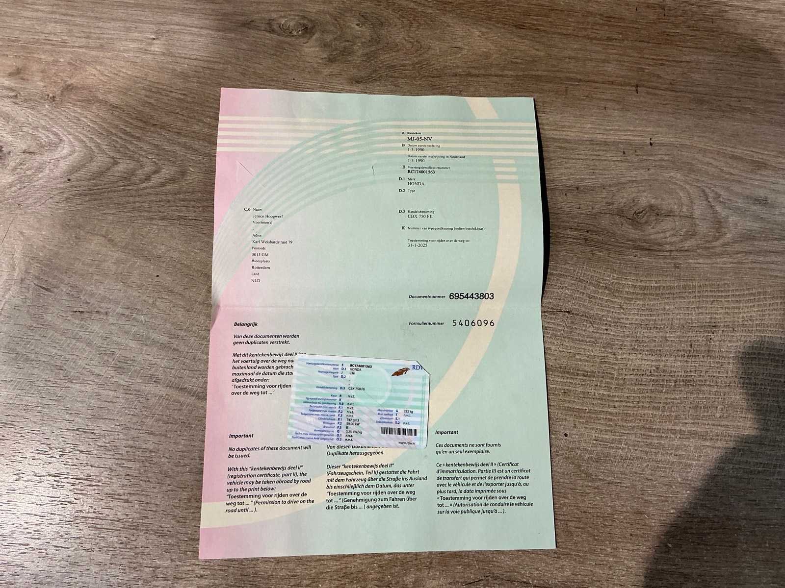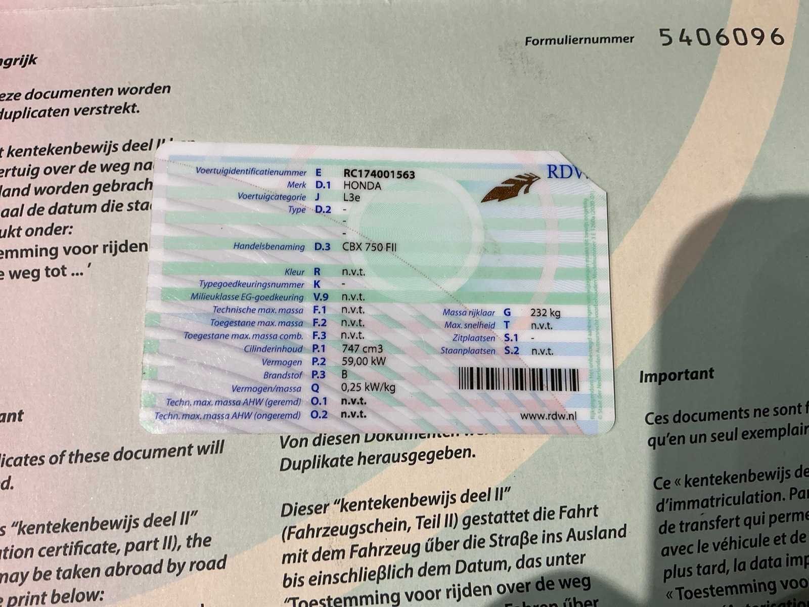<Br> - Inschrijvingsbewijs: Nederlandse inschrijvingsbewijs. - datum eerste inschrijving: 1/3/1990. - km-stand: onbekend. Merk: Honda Model: CBX 750 FII Brandstof: Benzine Chassisnummer: RC174001563 Cilinderinhoud: 747cc Vermogen (kW): 59kW