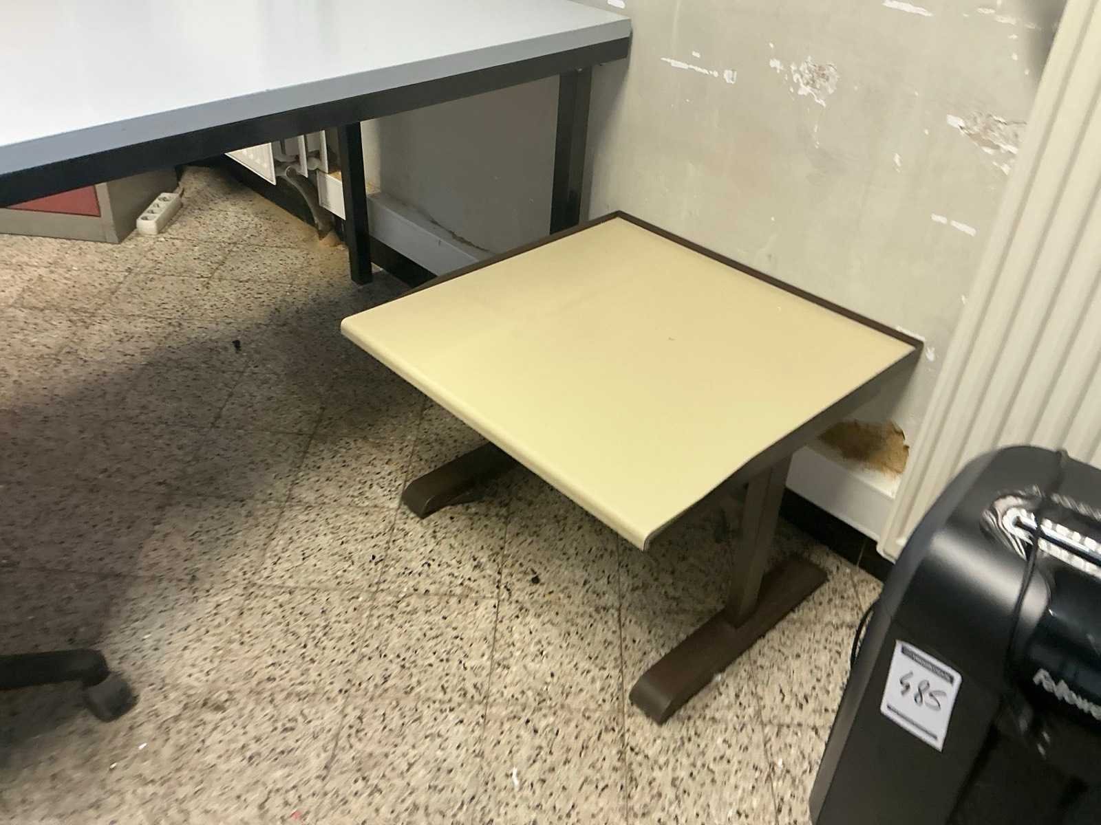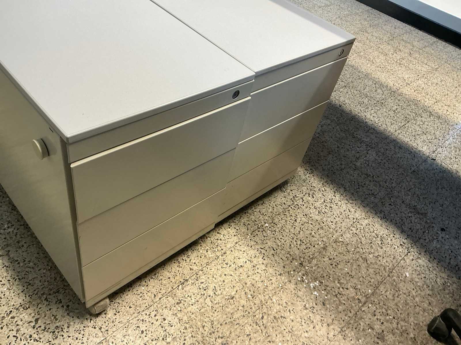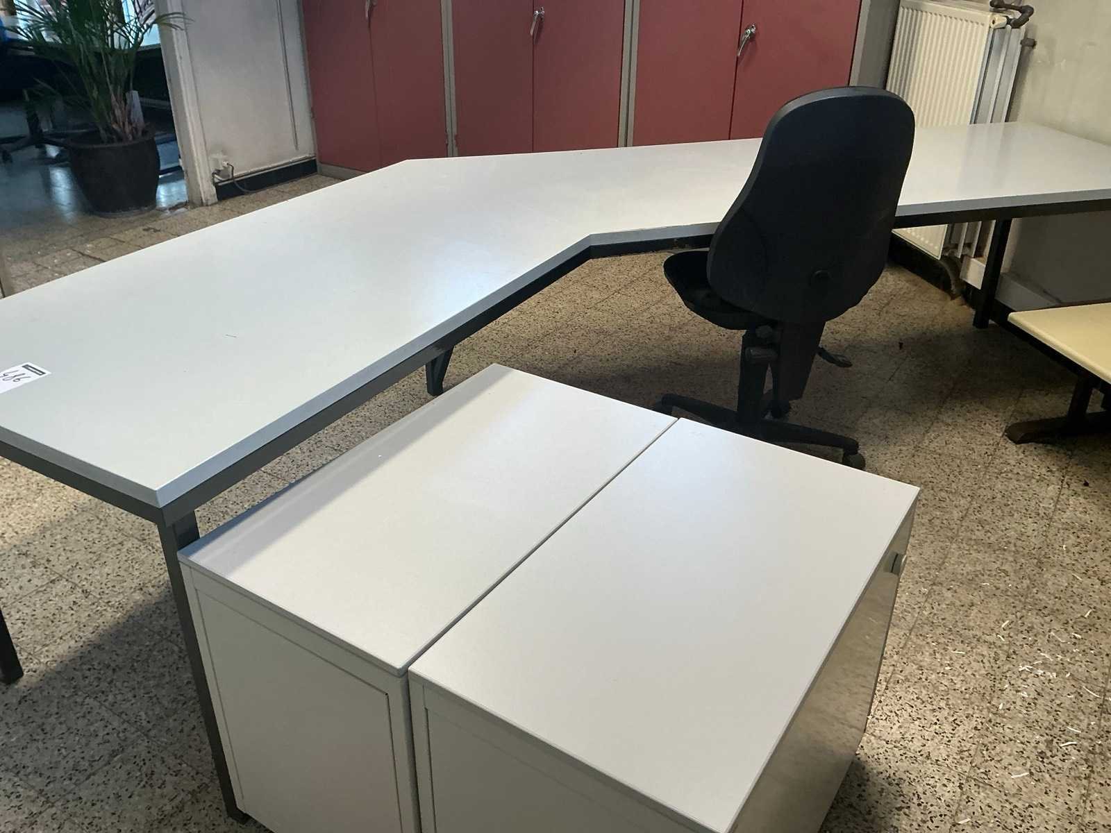 Bestaande uit: hoekopgesteld bureau, 1 bureaustoel, 2 mobiele ladenkasten, tafel