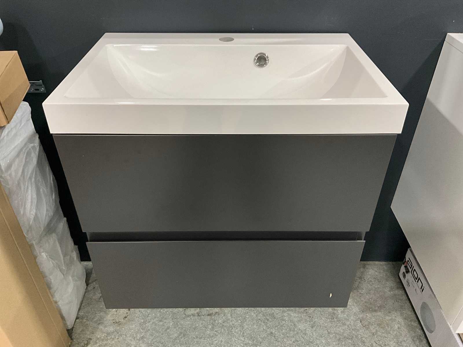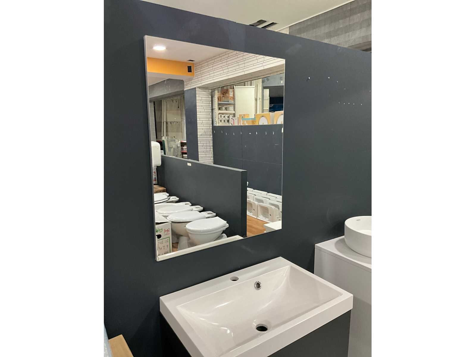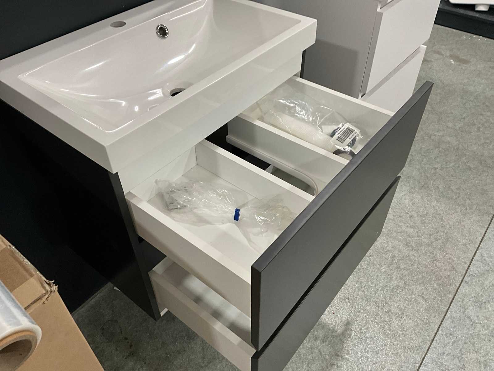 Bestaande uit hangkast 50x46x57cm, Aloni wastafel 35x35x12cm, spiegelkast, glazen tablet Merk: Van Marcke Model: Roxanne Materiaal: Keramiek, hout