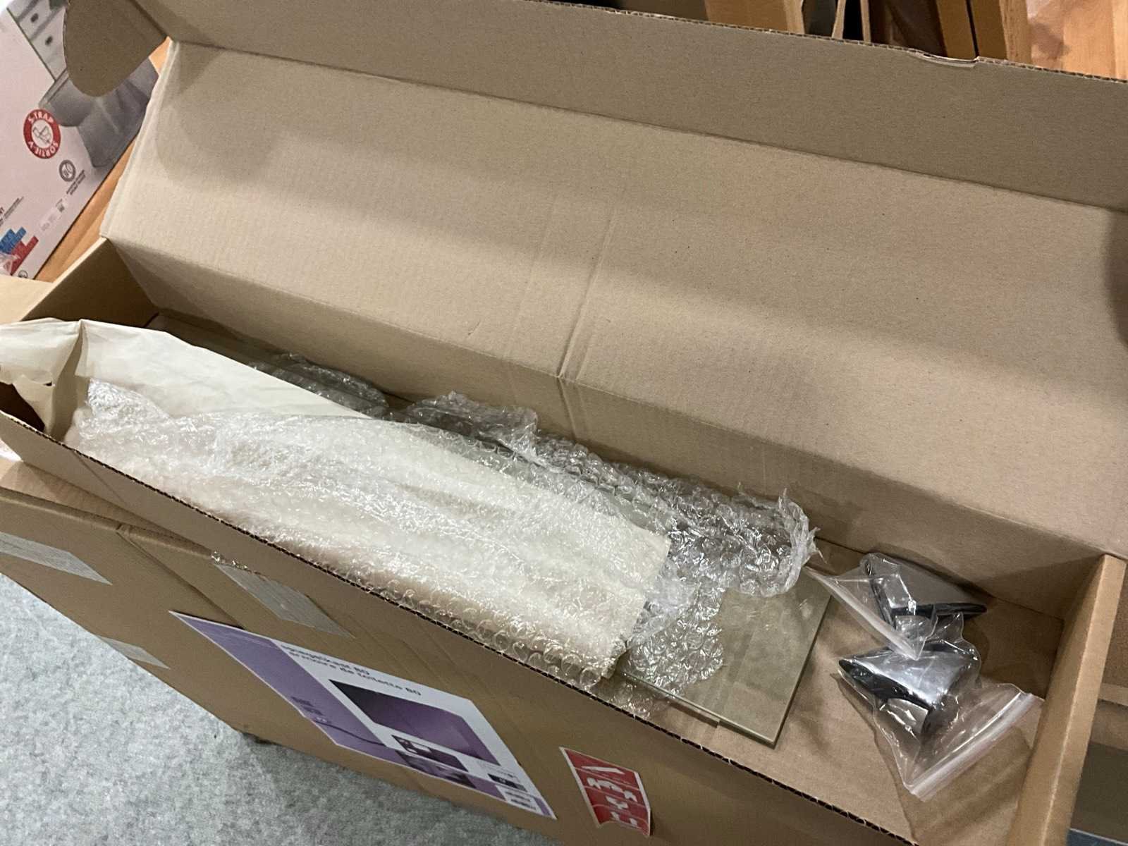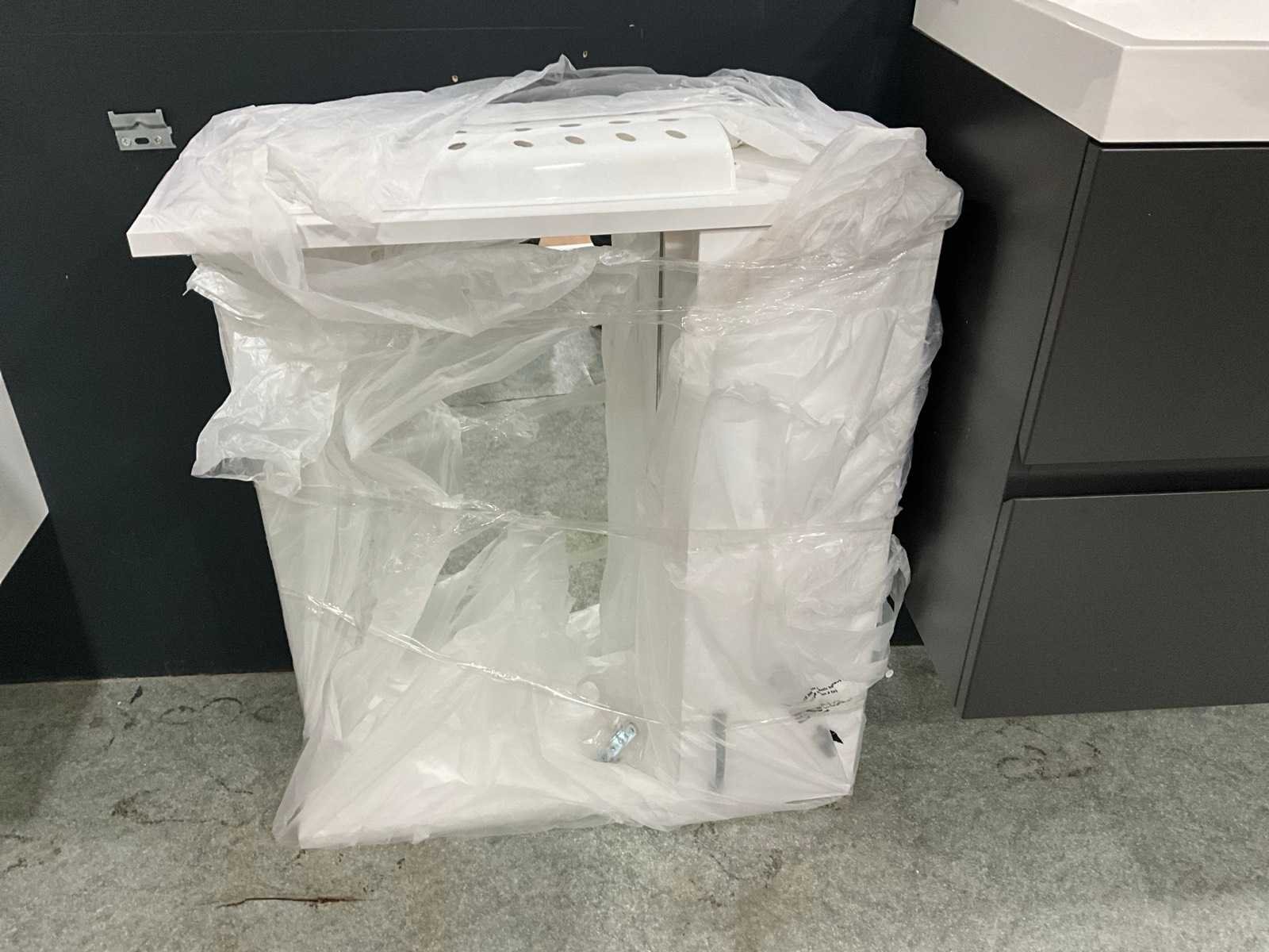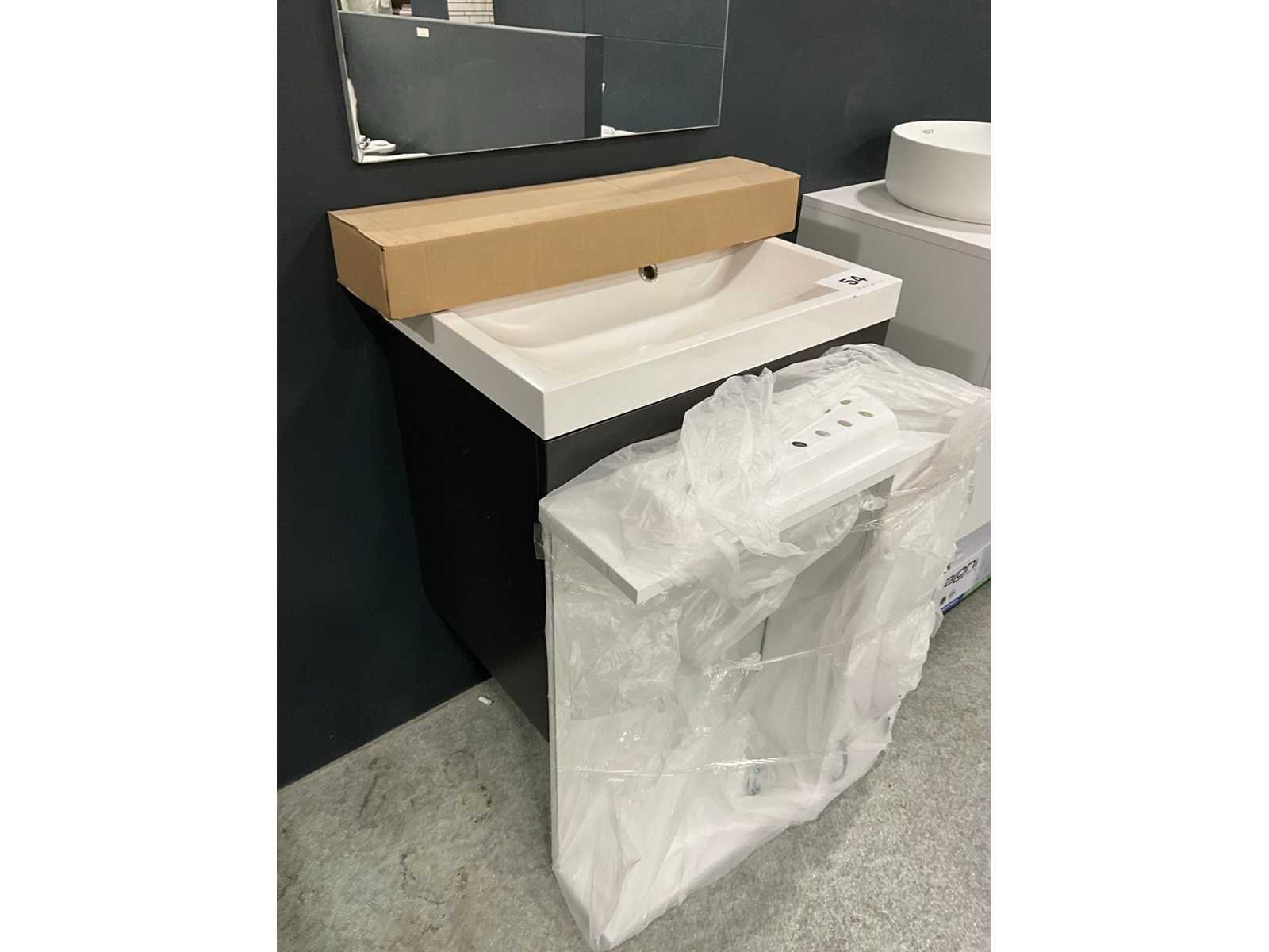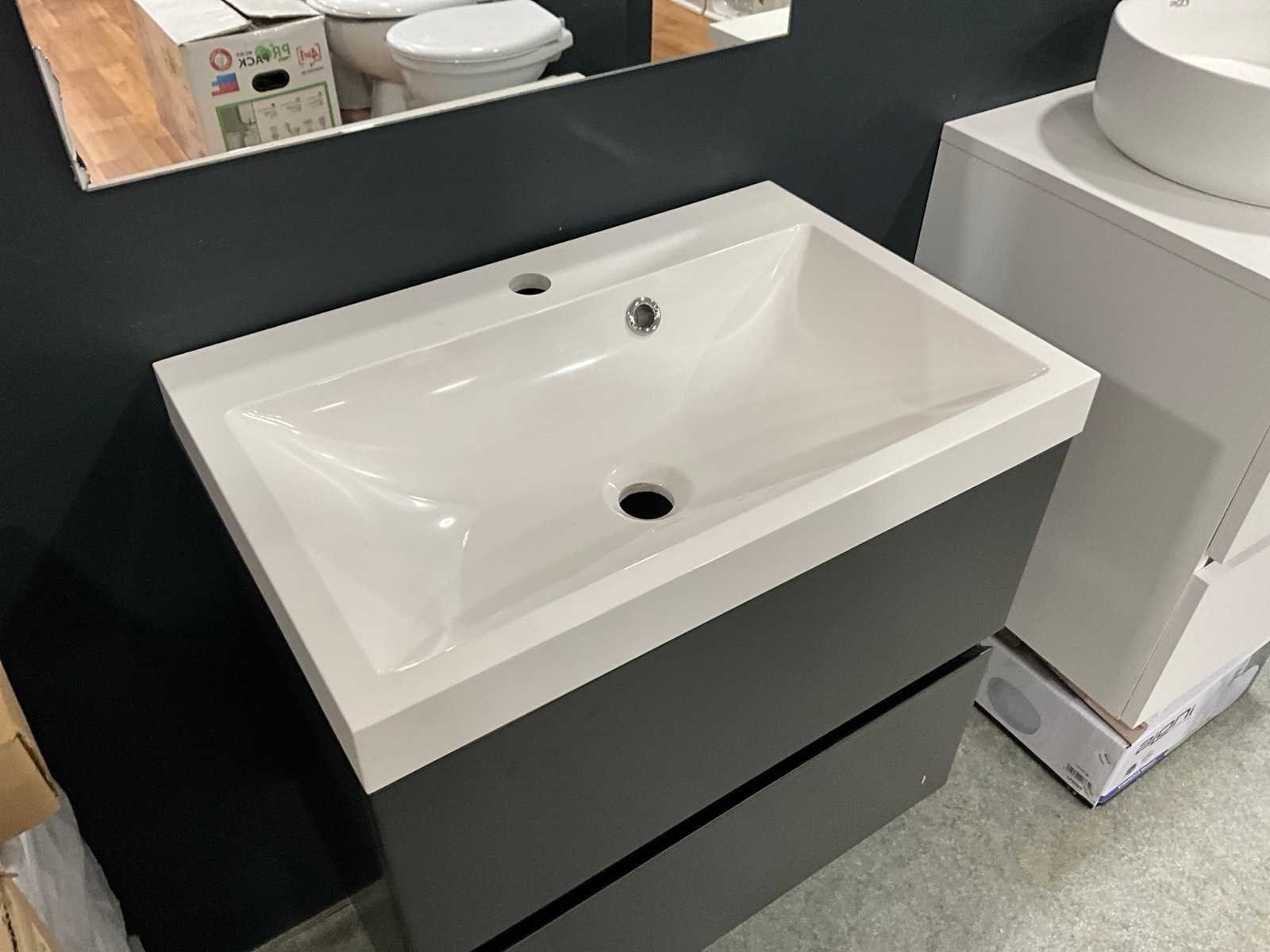 Bestaande uit hangkast 50x46x57cm, Aloni wastafel 35x35x12cm, spiegelkast, glazen tablet Merk: Van Marcke Model: Roxanne Materiaal: Keramiek, hout