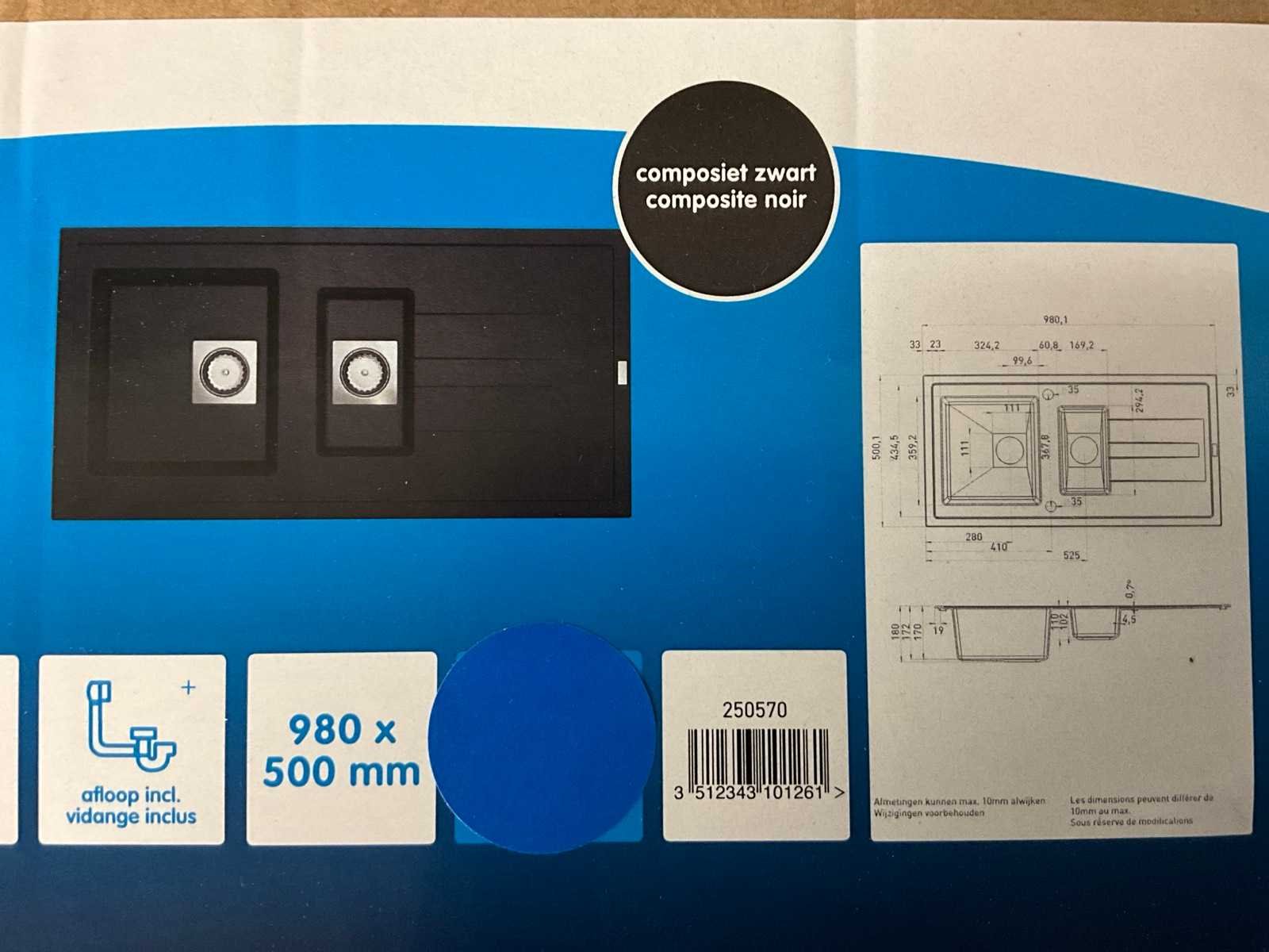 Composiet zwart Merk: Van Marcke Évier Lengte: 50cm Breedte: 98cm