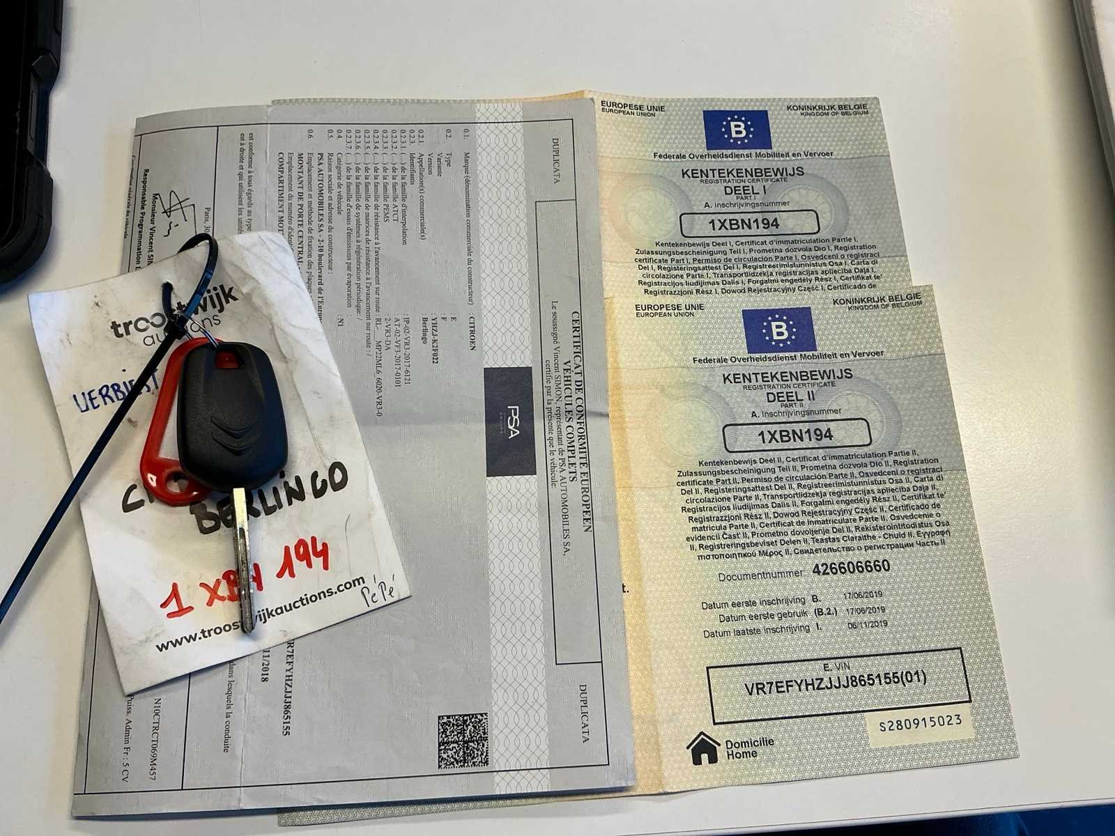 <Br> - Inschrijvingsbewijs: deel1 aanwezig, deel2 aanwezig. - Gelijkvormigheidsattest: aanwezig. - Gebruikssporen. Merk: Citroën Type: Berlingo Chassisnummer: VR7EFYHZJJJ865155 Afgelezen kilometerstand: 219101km Cilinderinhoud: 1500cc Vermogen (kW): 96kW Brandstof: diesel Datum eerste inschrijving: 17/06/2019 Transmissie: Handgeschakeld Aantal sleutels: 1