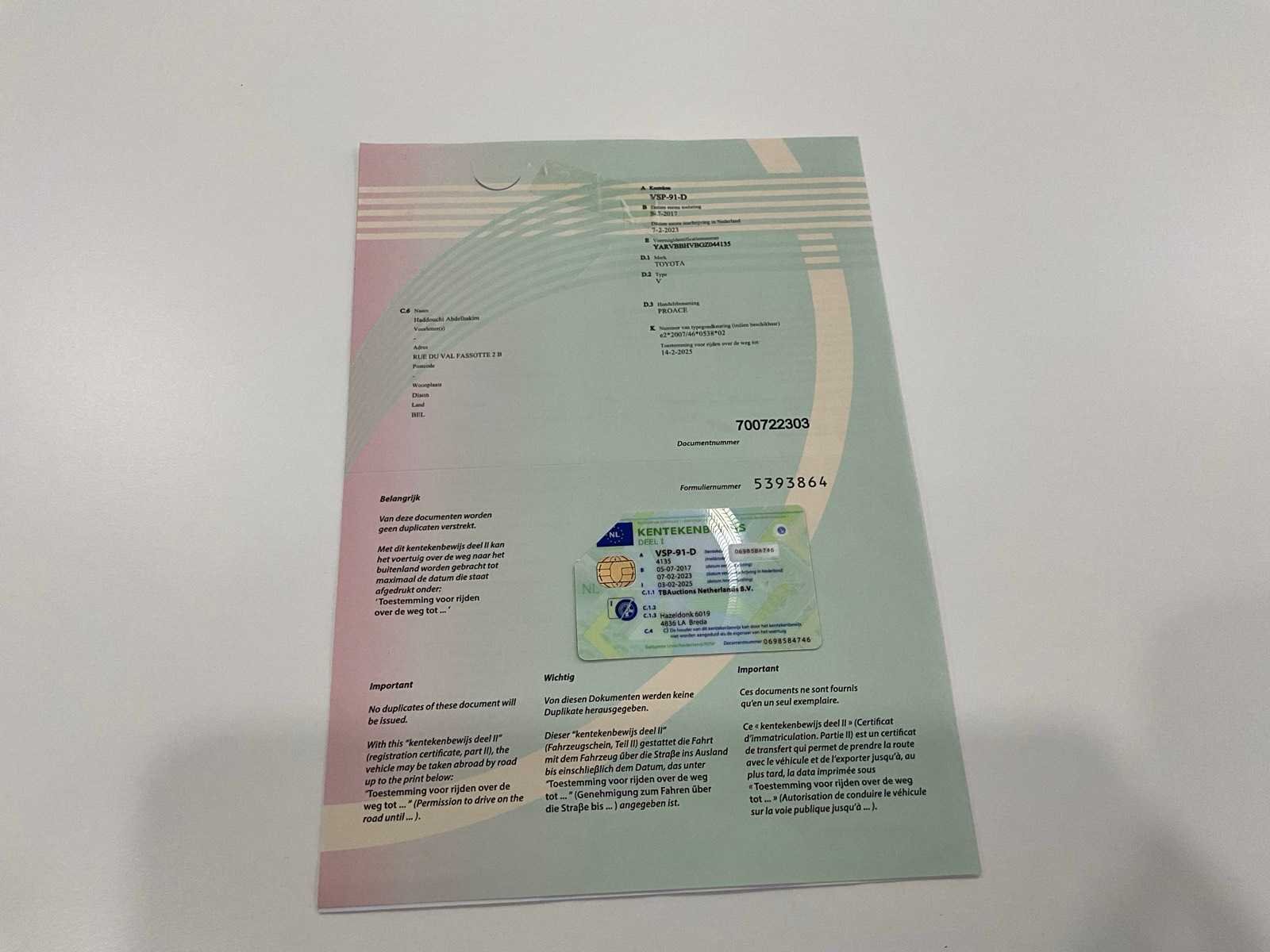 MTM: 2640kg, NL kentekenbewijs aanwezig, sleutel aanwezig, gebruikssporen, carrosserie schade, raam gebarsten Merk: Toyota Type: Proace Chassisnummer: YARVBBHVBGZ044135 Afgelezen kilometerstand: 154878km Cilinderinhoud: 1560cc Vermogen (kW): 70kW Brandstof: diesel Datum eerste toelating: 05/07/2017 Transmissie: Handgeschakeld Aantal zitplaatsen: 3 Emissieklasse: Euro 6x Startinformatie: Start en rijdt