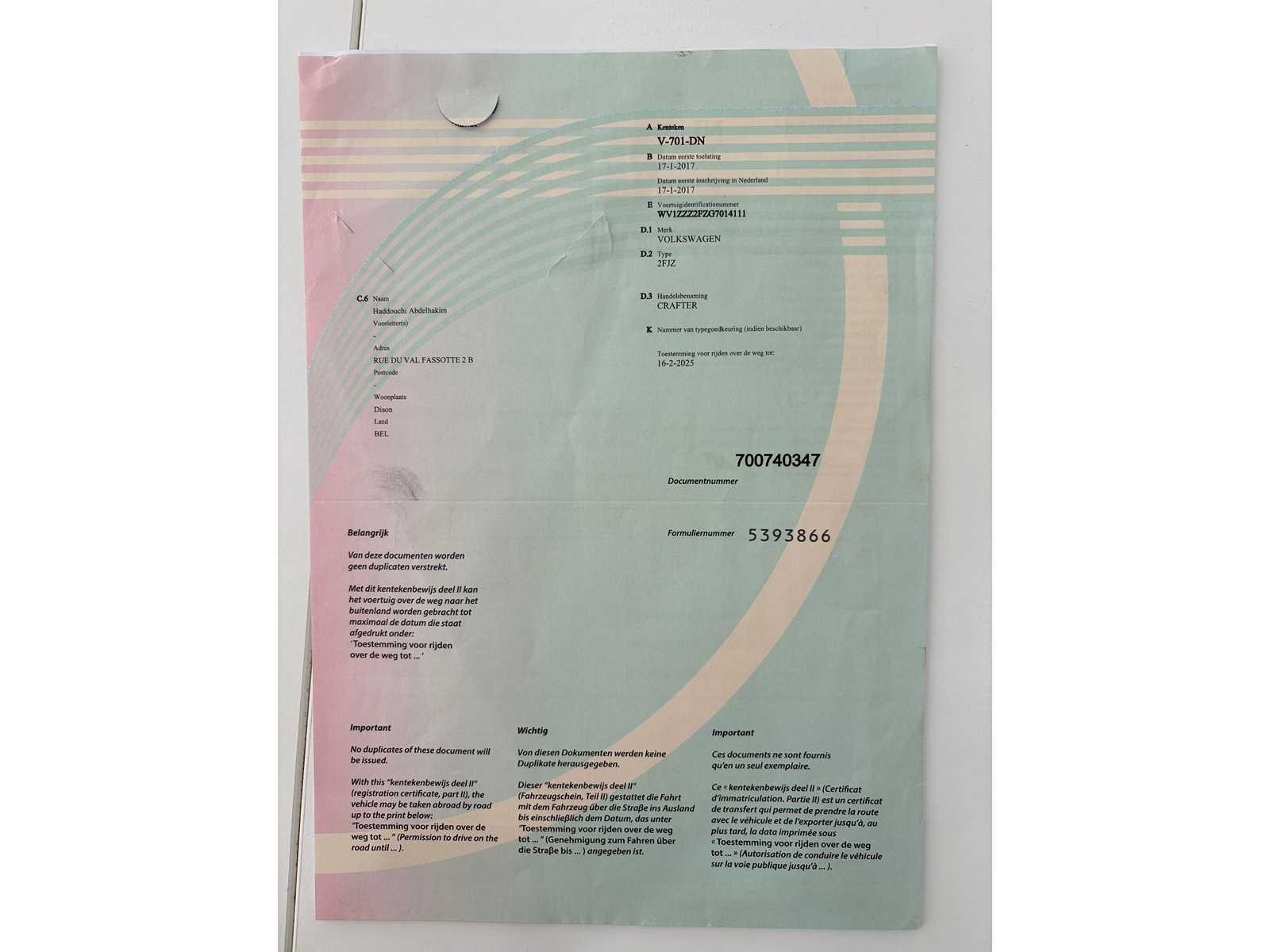 Start niet wegens technisch probleem; Merk: Volkswagen Model: Crafter Type: 2FJZ Bouwjaar: 2017 Afgelezen kilometerstand: 162096km Cilinderinhoud: 1968cc Vermogen (kW): 120kW Brandstof: Diesel Chassisnummer: WV1ZZZ2FZG7014111 Datum eerste toelating: 17-01-2017 Aantal zitplaatsen: 3 Kleur: Wit Transmissie: Manueel Aantal sleutels: 1 Nationaliteit documenten: België Inschrijvingsbewijs - deel 1 : aanwezig Inschrijvingsbewijs - deel 2: aanwezig