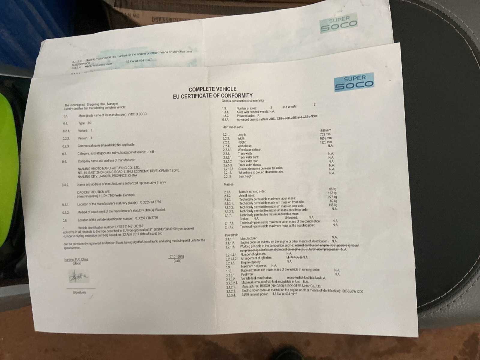 1 sleutel aanwezig,gelijkvormigheid attest aanwezig,kentekenbewijs deel 1+2 aanwezig,1 batterij aanwezig met oplaadkabel. Batterij leeg,start niet. Merk: Soco Super Model: TS Limited Type: TS1 Datum eerste toelating: 2018 Transmissie: Automaat Brandstof: Elektrisch Afgelezen kilometerstand: 0km Chassisnummer: LYSTS1114J1000286(1)