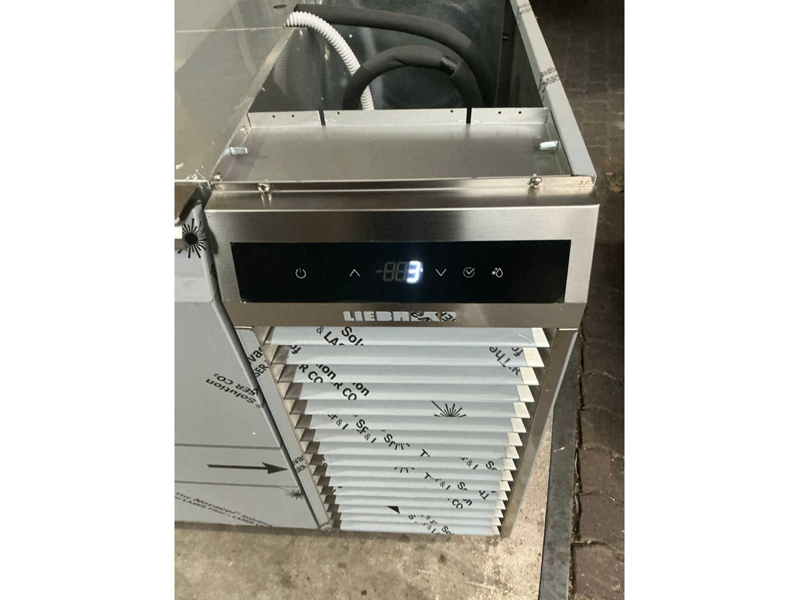 Ongebruikte rvs koelwerkbank voorzien van 3 lades, 3 klapdeuren en 6 in hoogte verstelbare roosters Merk: Liebherr Type: FRTSvg 7570 Totale afmeting L: 227cm Totale afmeting Breedte: 68cm Totale afmeting Hoogte: 81cm Digitale uitlezing: true Ingebouwde koelcompressor: true Rvs: true Aansluiting: 230V Aantal laden: 3pcs