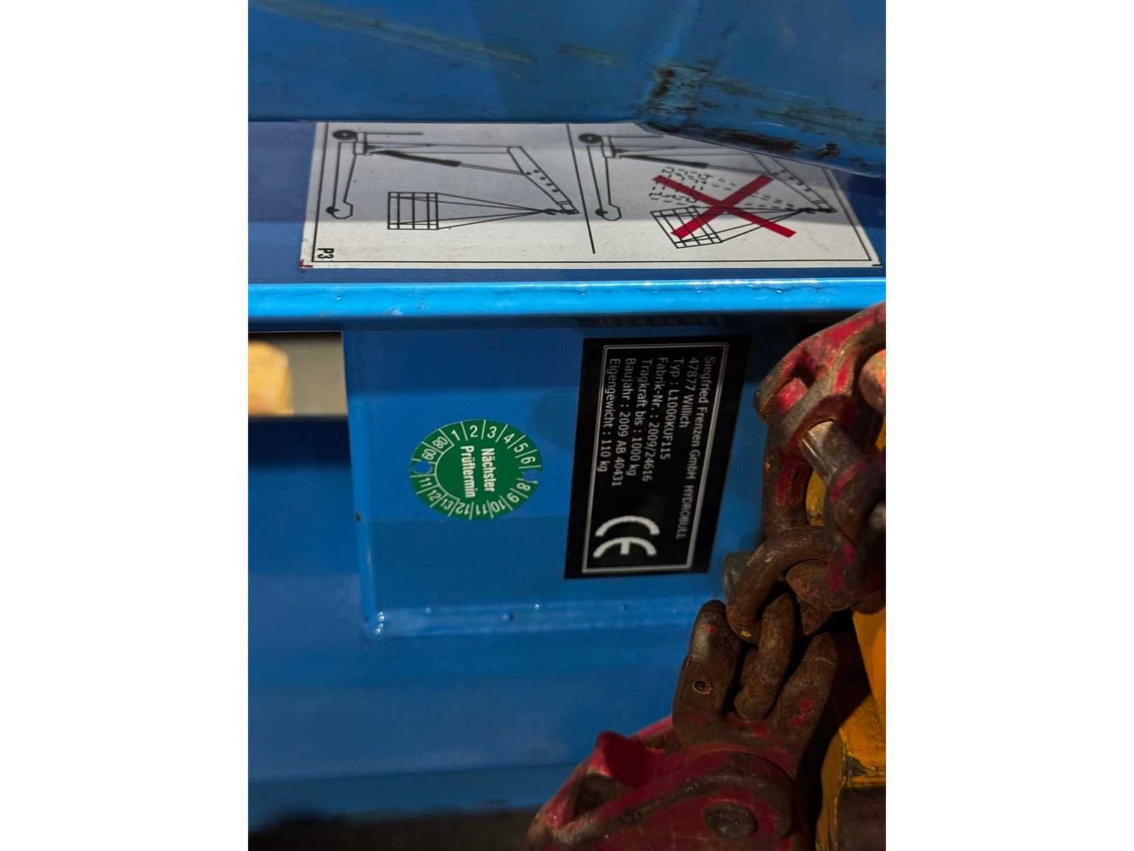 Met spreader beam. Merk: Siegfried Frenzen Type: L1000KUF115 Bouwjaar: 2009 Hefvermogen: 1000kg Eigen gewicht: 110kg Totale afmeting L: 1700mm Totale afmeting Breedte: 1000mm Totale afmeting Hoogte: 500mm