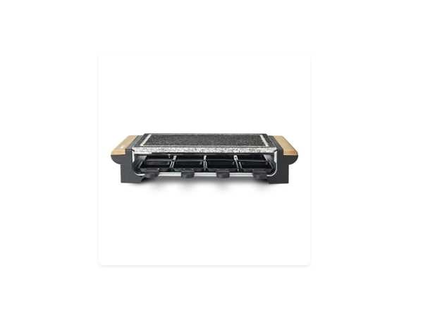 Kenmerken Granietsteen en raclette 8 personen Kookruimte: 37 x 23 cm Instelbare temperatuur Thermostaat met indicatielampje Verwijderbare steen voor eenvoudige schoonmaak Houten handvatten Accessoires: 8 antiaanbakpannen Vermogen: 1400 W Non Merk: H.Koenig
