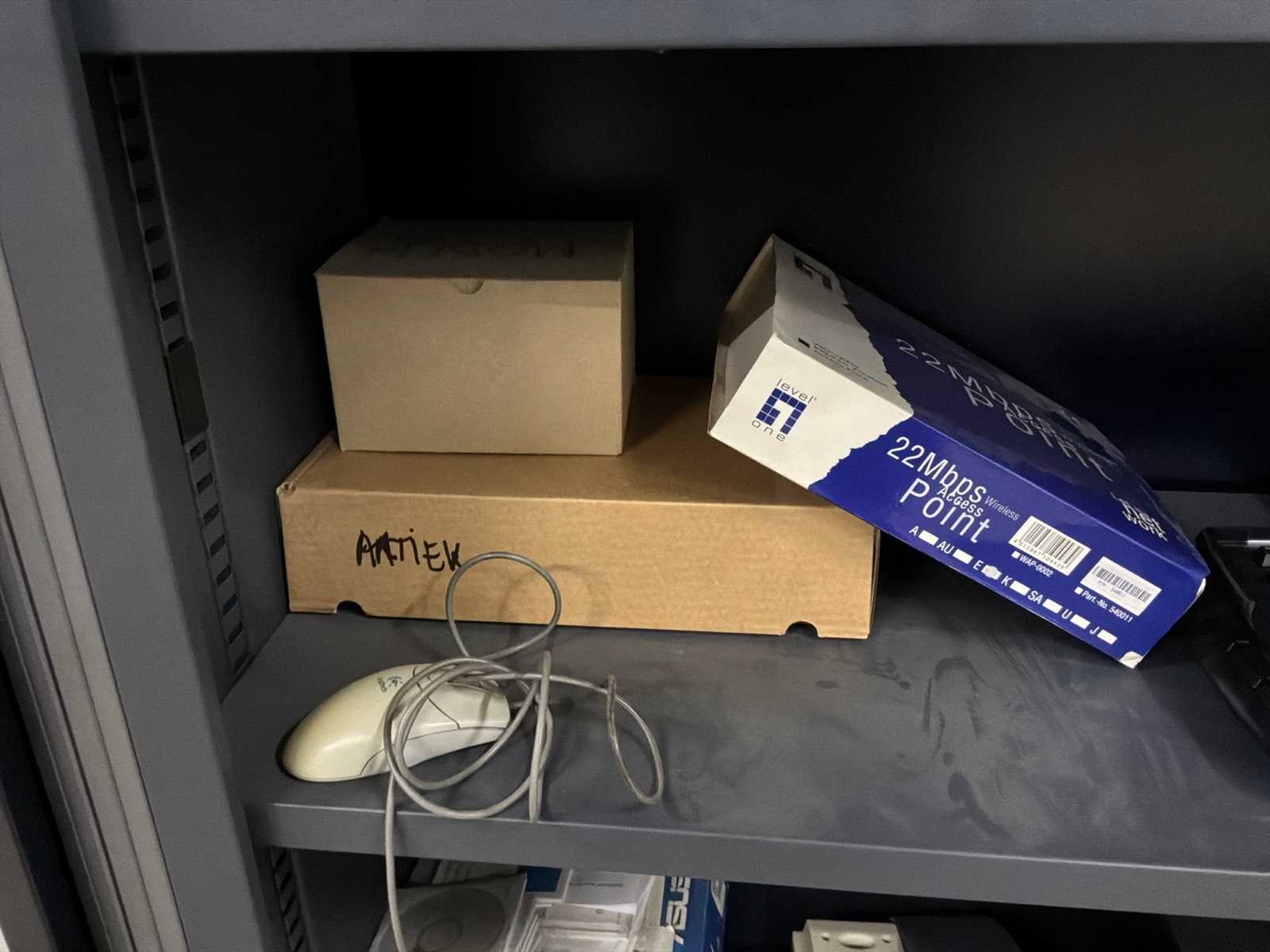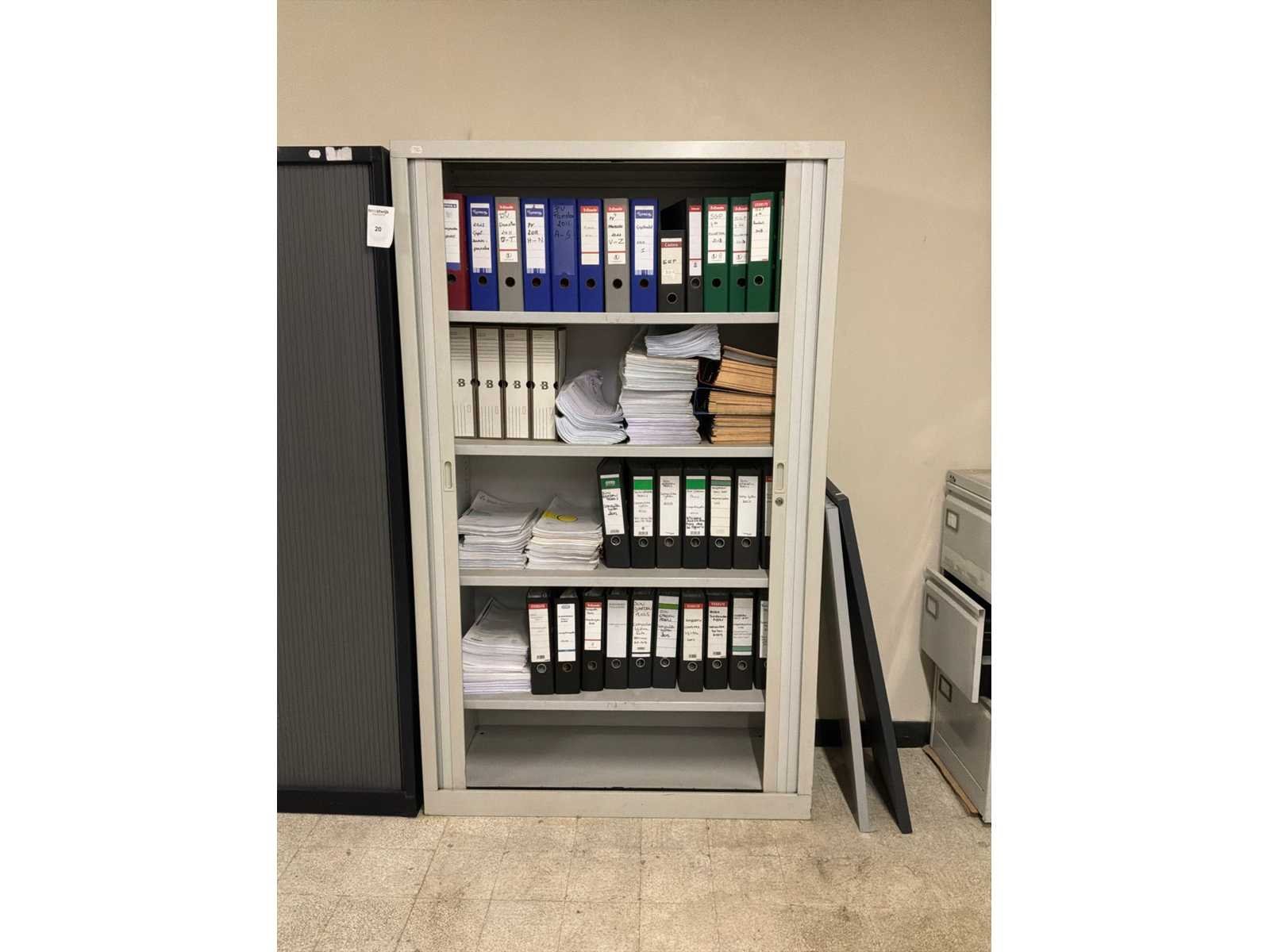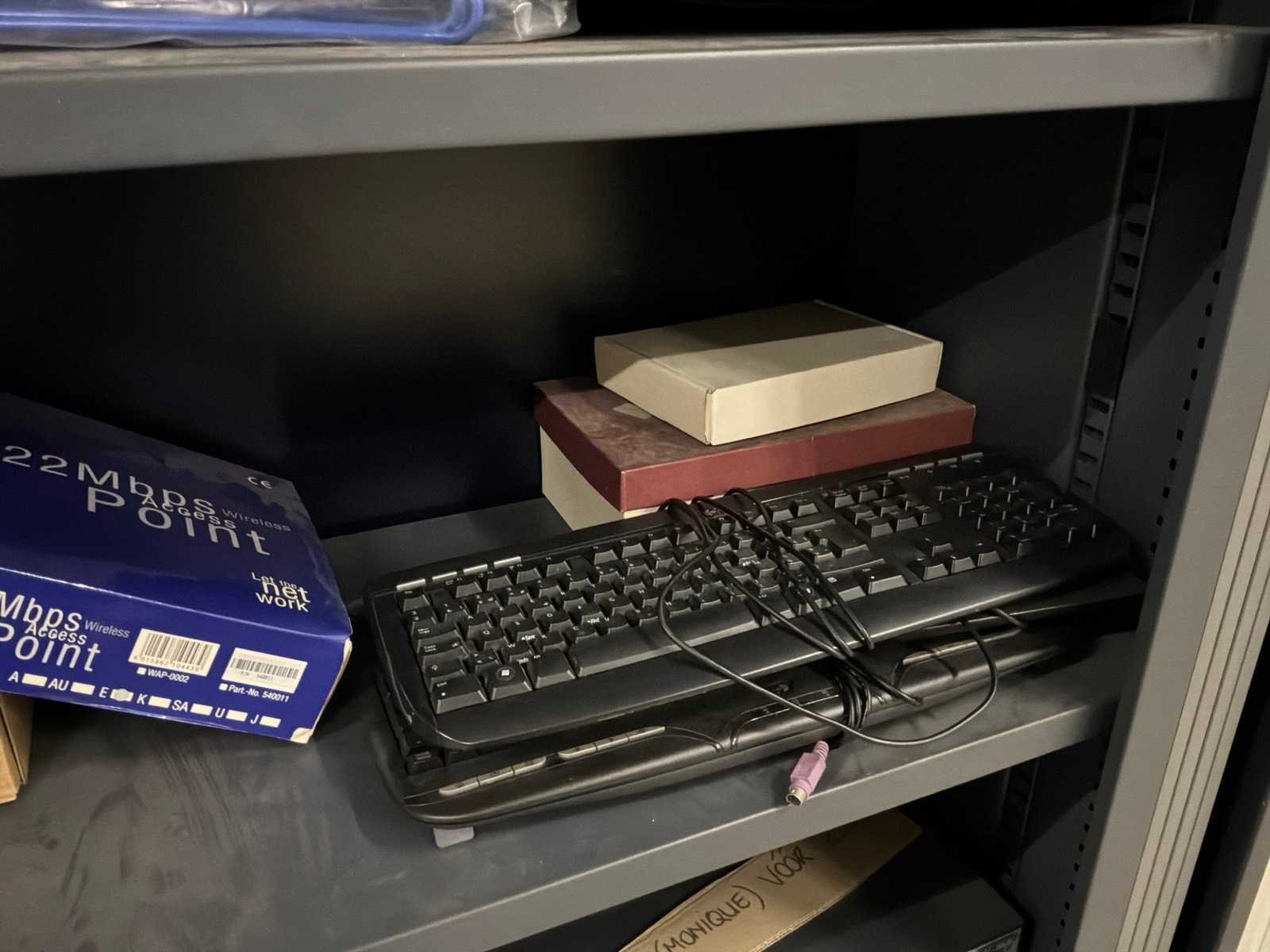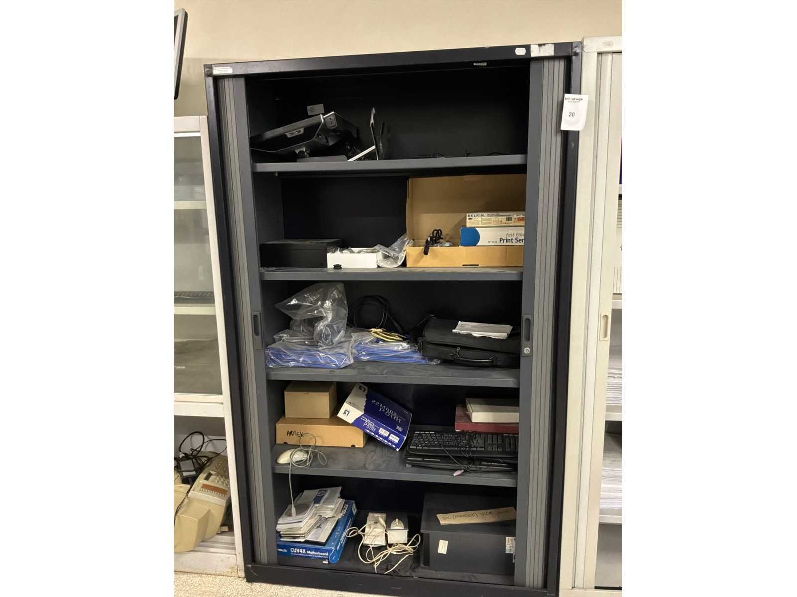 Met inhoud, waaronder verschillende IT materiaal waarvan werking onbekend, inloggegevens/paswoorden niet gekend. 3x pc, 1x laptop, 1x server, 4x monitor, 5x toetsenbord, 1x faxtoestel. Boekhouding in lichtgrijze kast niet inbegrepen.