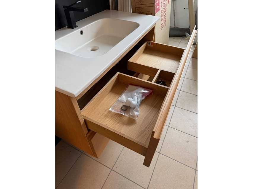 Sanijura Lumen 100cm massief eiken wastafelmeubel met mat witte waskom en spiegelkast Non Merk: Sanijura Model: Lumen Product type: Wastafelkast Lengte: 100cm Breedte: 50cm Materiaal: Massief natuurlijk eiken