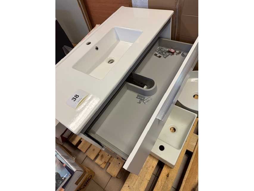 Sanijura doblo kast 100cm + porseleinen bassin en zuil Non Merk: Sanijura Model: doblo 100cm Lengte: 100cm Breedte: 50cm Kleur: Wit