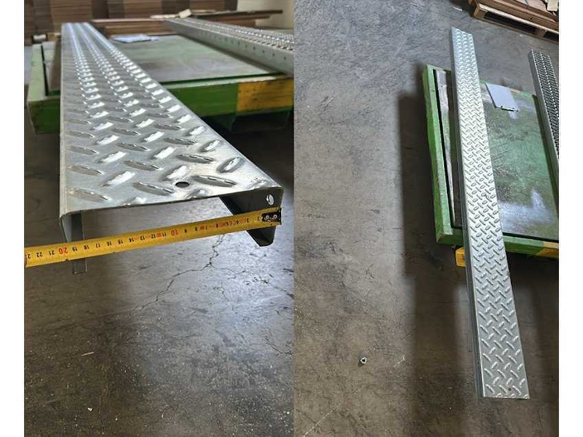 5 ton gestapelde gegalvaniseerde stalen vloerpanelen gebruikt voor industriële bouwvloeren. De panelen zijn netjes op een houten pallet geplaatst, klaar voor installatie of transport. Deze elementen worden doorgaans gebruikt als dragende componenten in mezzanines, fabrieksvloeren of verhoogde platforms, en bieden sterke en duurzame ondersteuning voor zware industriële toepassingen. Op de achtergrond zijn verschillende grote transportkisten te zien in een magazijnomgeving. Per paneel: LANG- 3M HOOGTE - 75MM BREEDTE - 0,20M GEWICHT - 23,2 KG