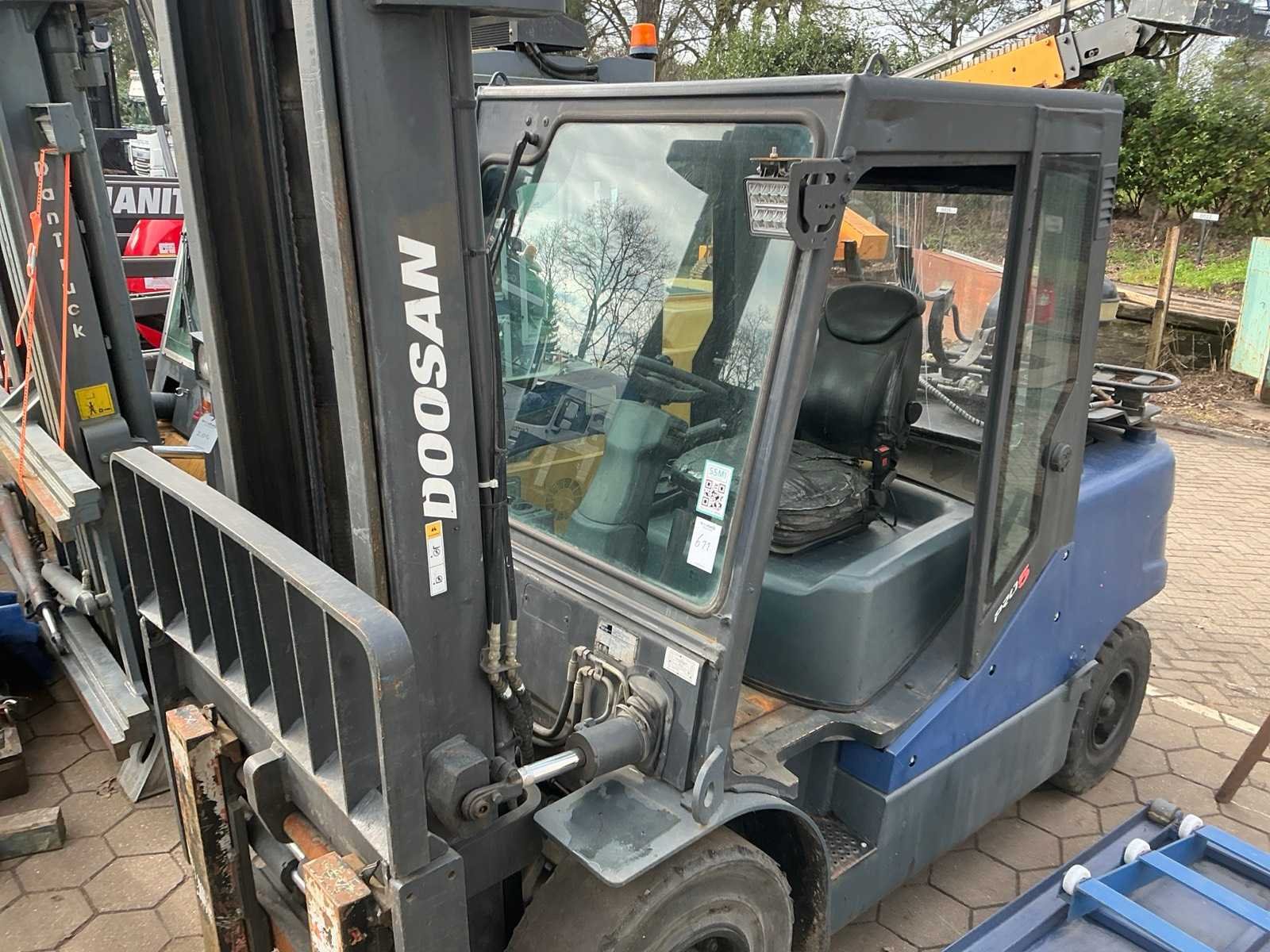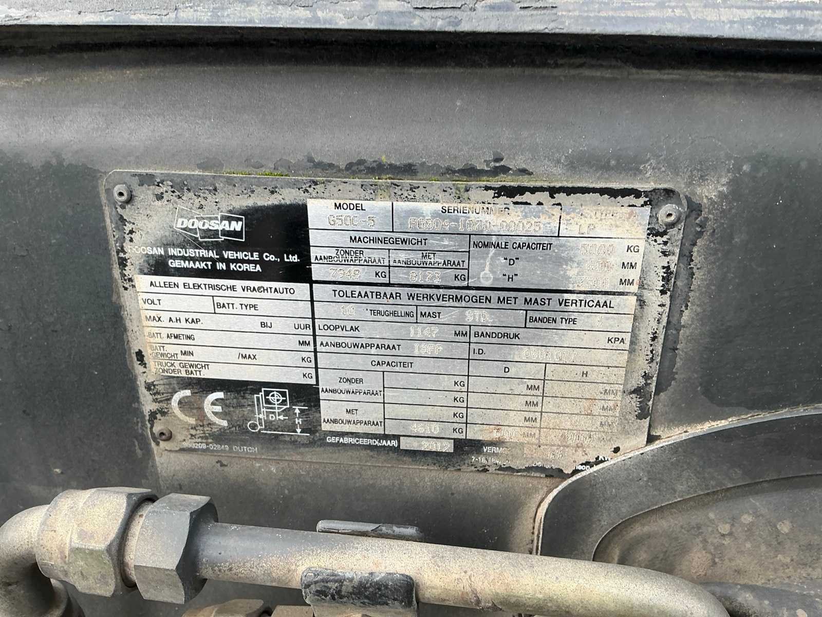 Merk: Doosan Type: G50C5 Bouwjaar: 2012 Serienummer: FGB04-1070-00025 Brandstof: LPG Hydraulisch verstelbare lepels: true Duplex mast: true Eigen gewicht: 8173kg Hefvermogen: 5000kg LPG: true