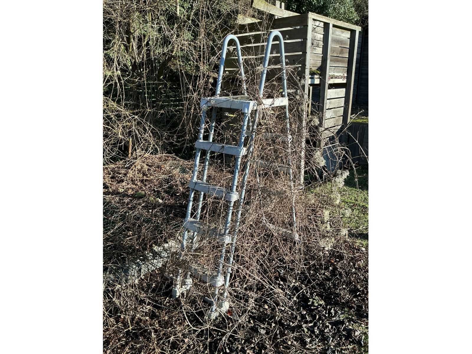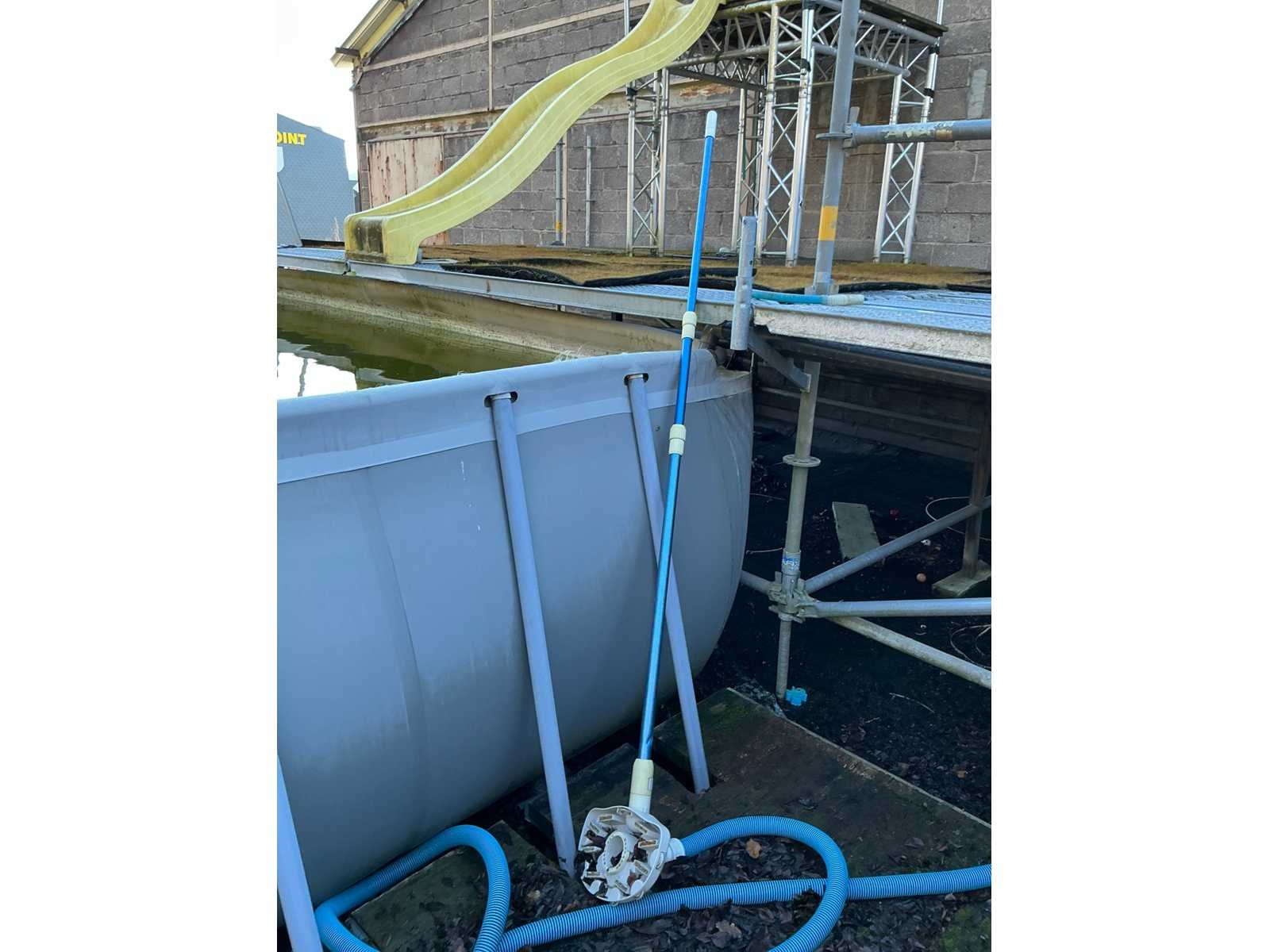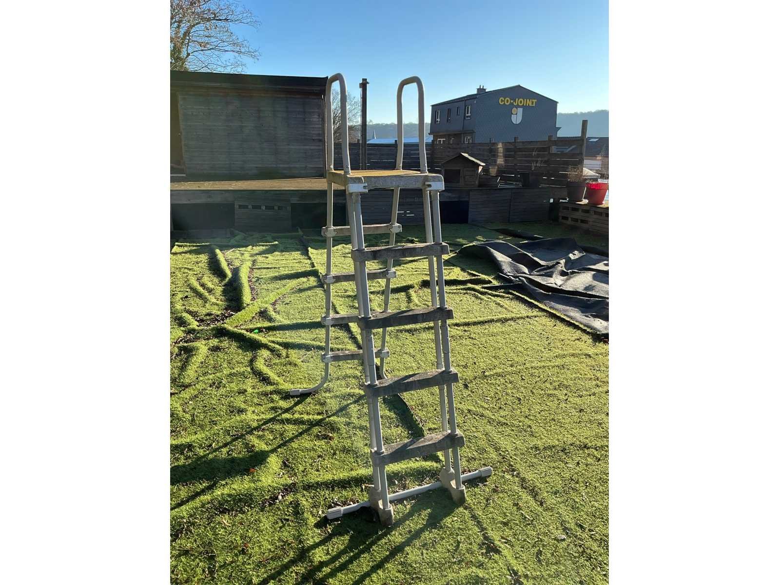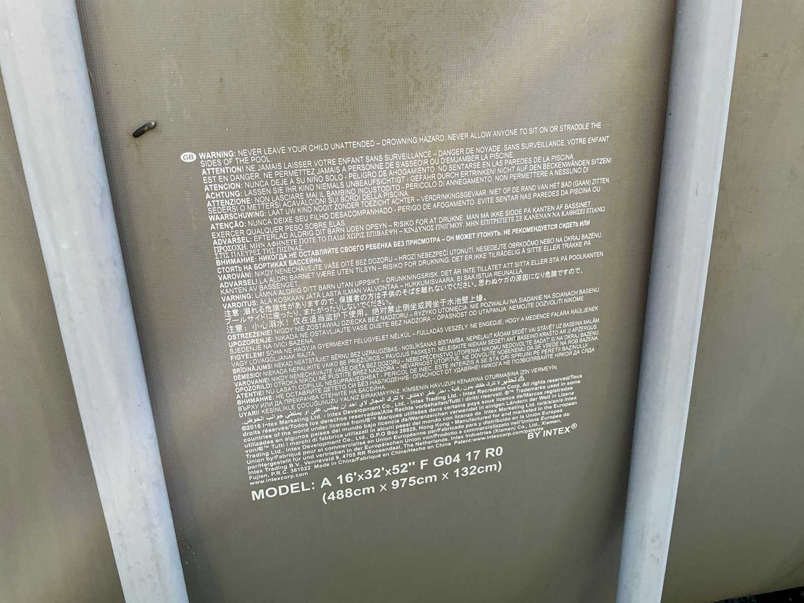 Compleet met filterinstallatie (werking onbekend), 2x dubbele trapladder, afrolsysteem met zwembadcover, alu ladder en pvc glijbaan. Zonder Trussplatform Non Merk: Intex Model: G04 17 R0 Lengte: 975cm Breedte: 488cm Hoogte: 132cm