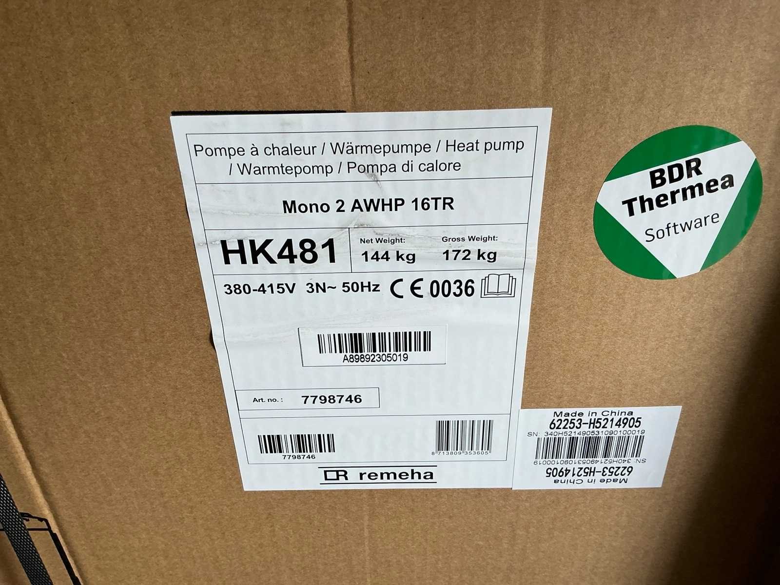 144kg, 380 Volt, nieuw in originele verpakking Non Merk: Remeha Model: HK481 Mono 2 AWHP 16TR