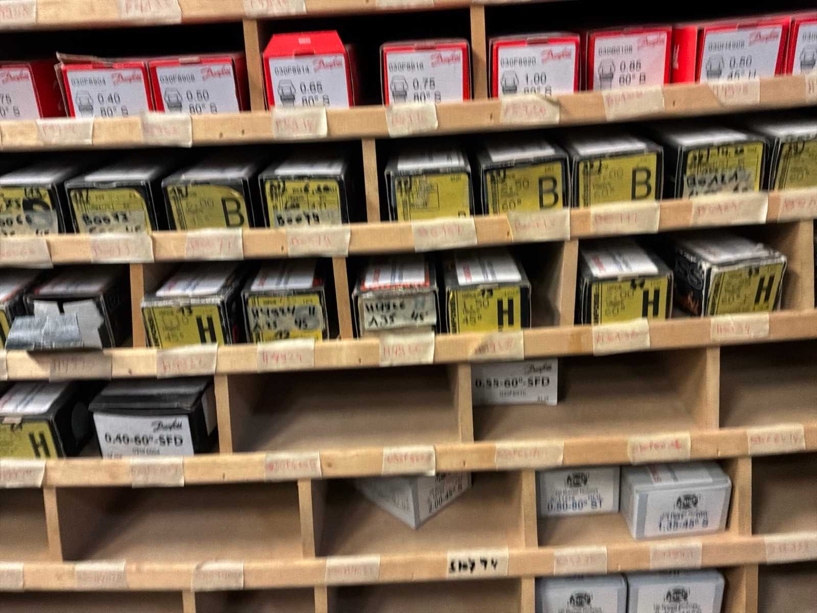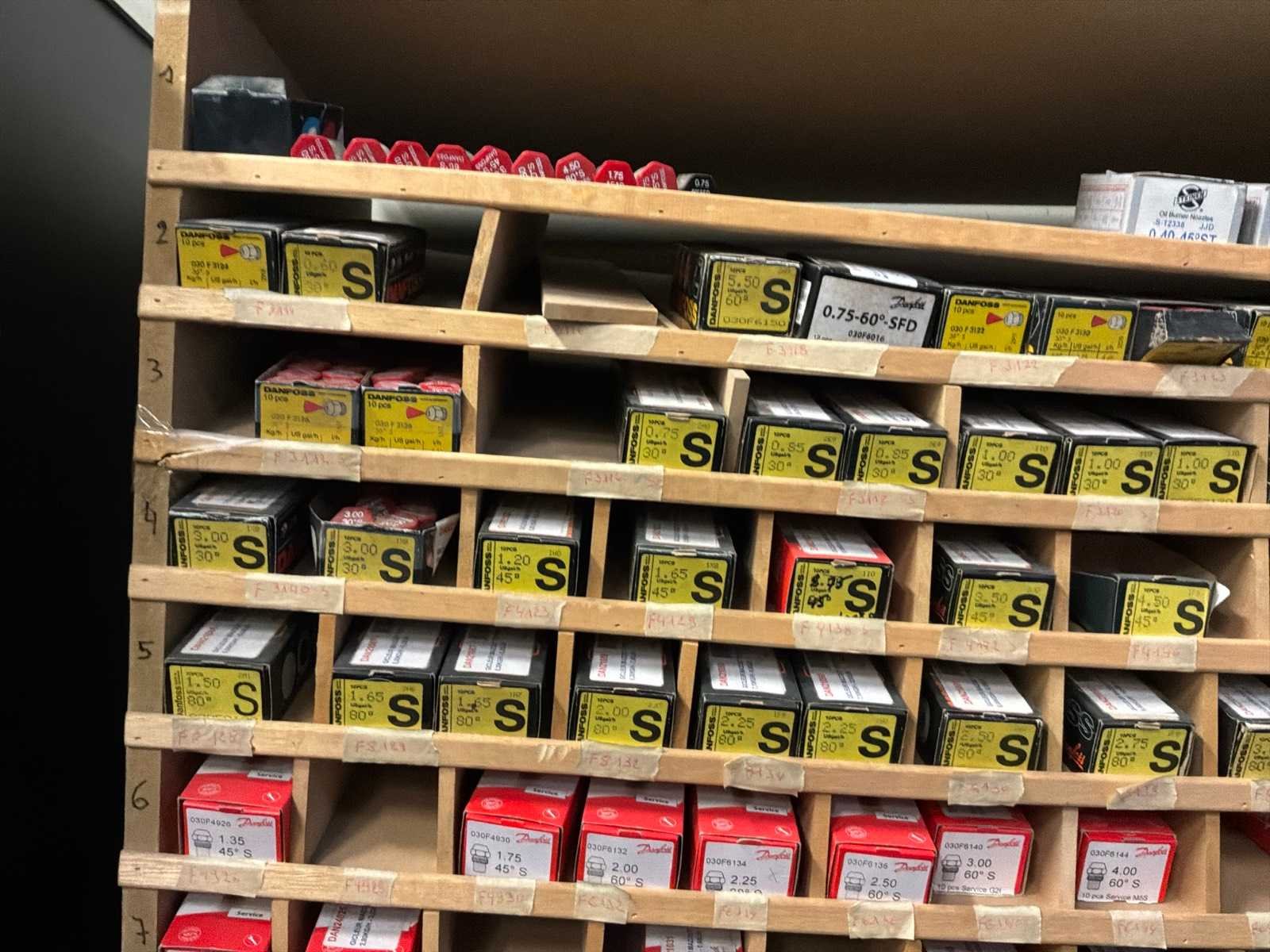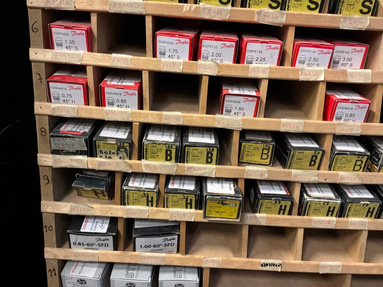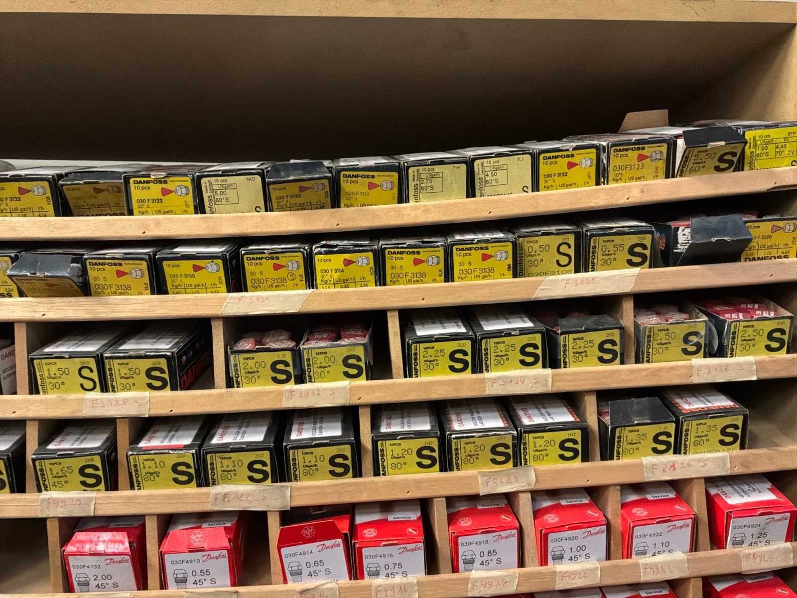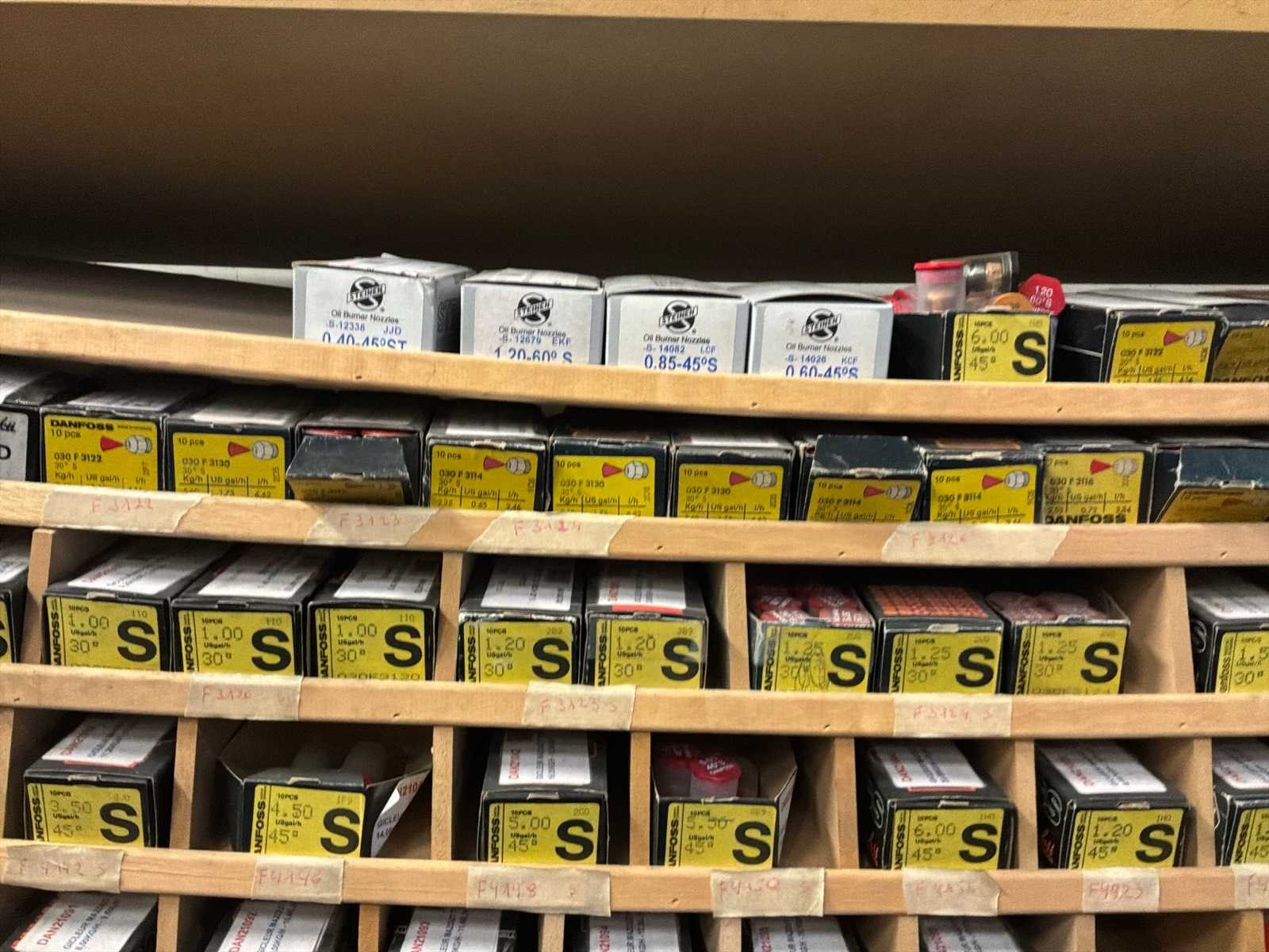 Inhoud rek: verschillende types mazout verstuivers (circa 190 stuks)