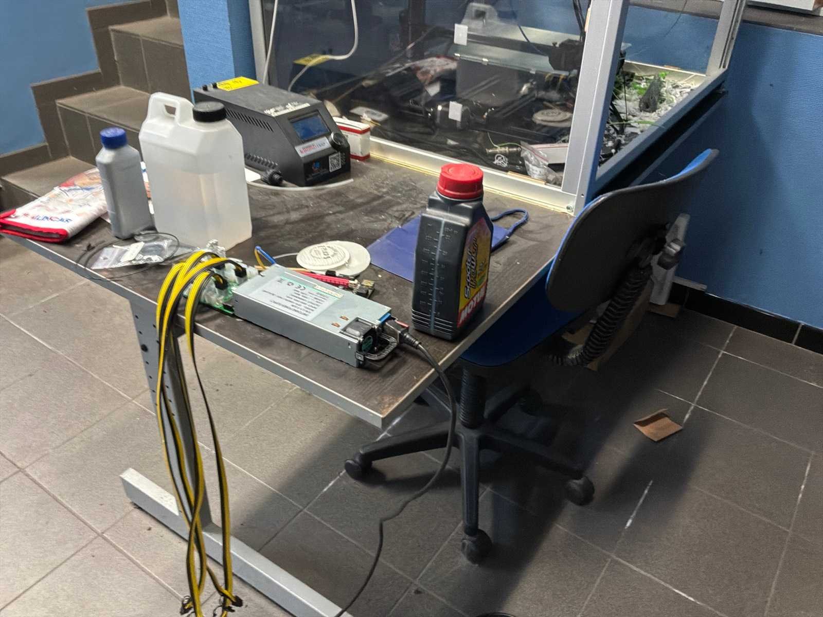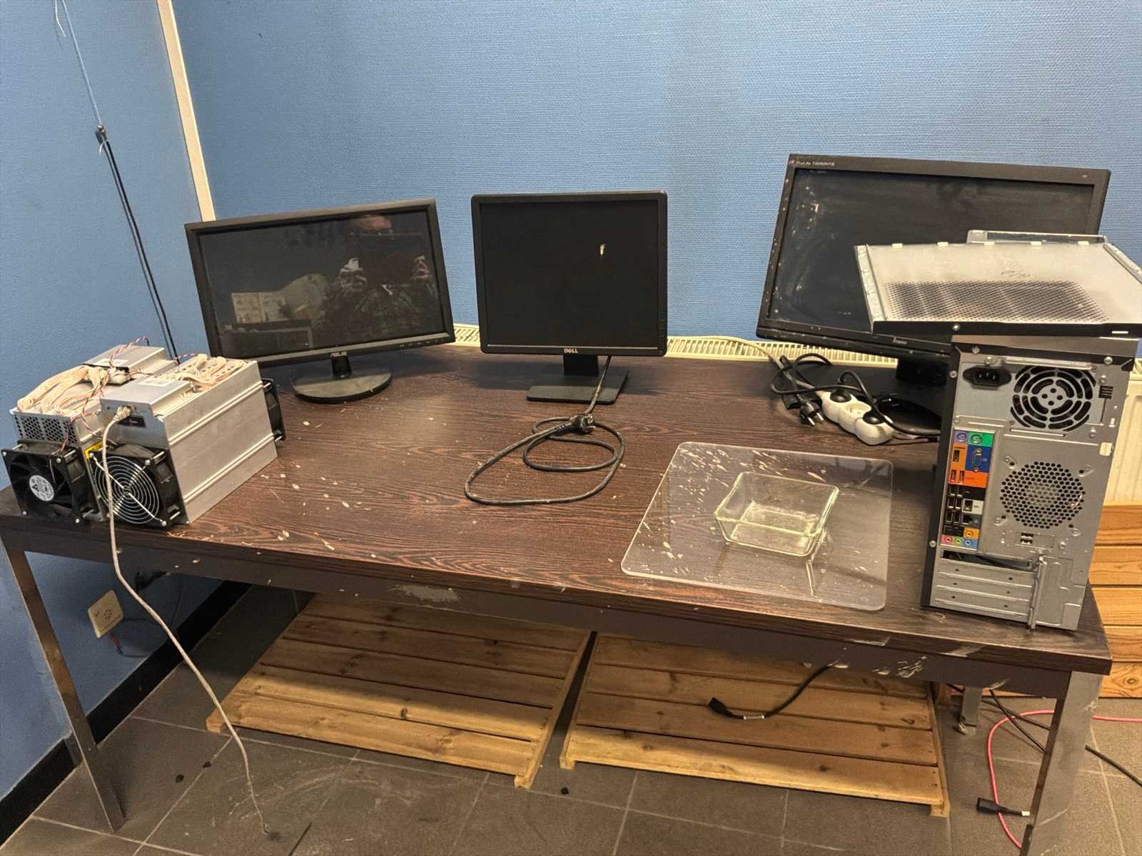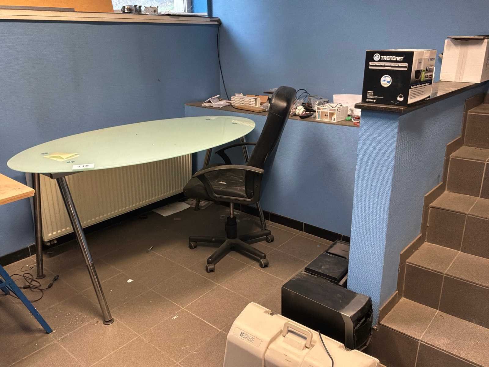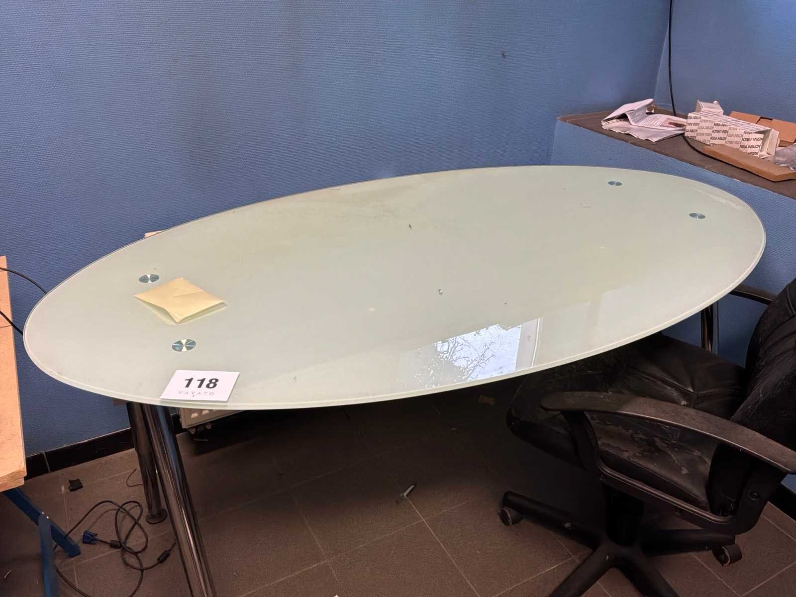 Ovaal model 180 x 100 x 88cm; bruine tafel 170 x 85 x 76cm met inhoud; bureautafel 160 x 80 x 73cm; vitrinekast 40 x 37 x 175cm; 2x bureaustoel’