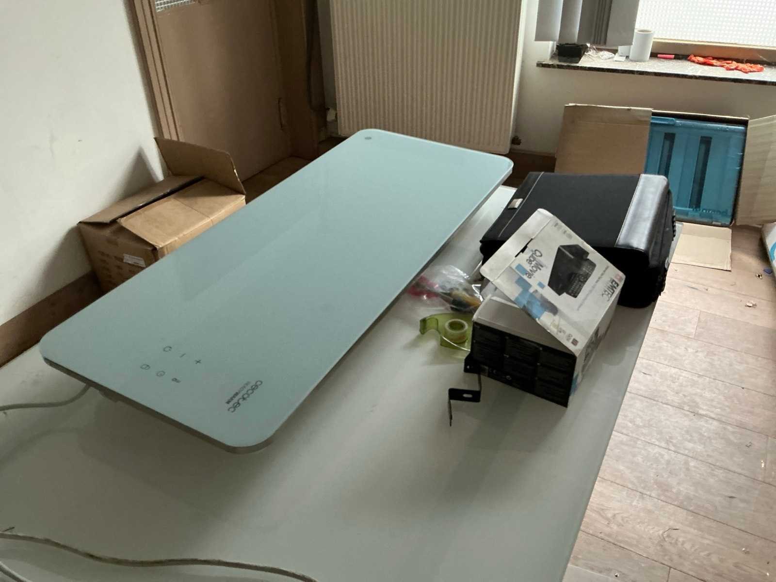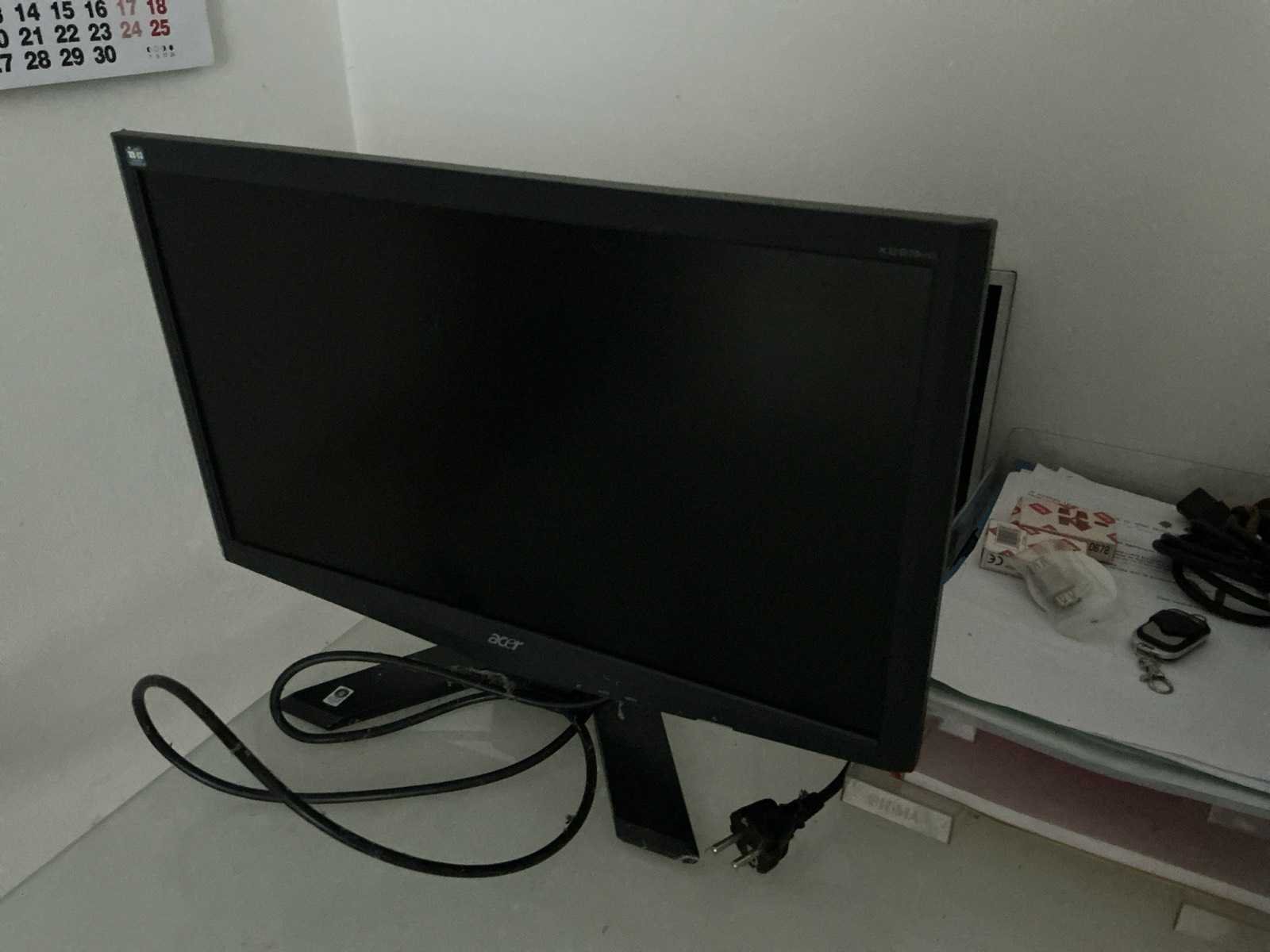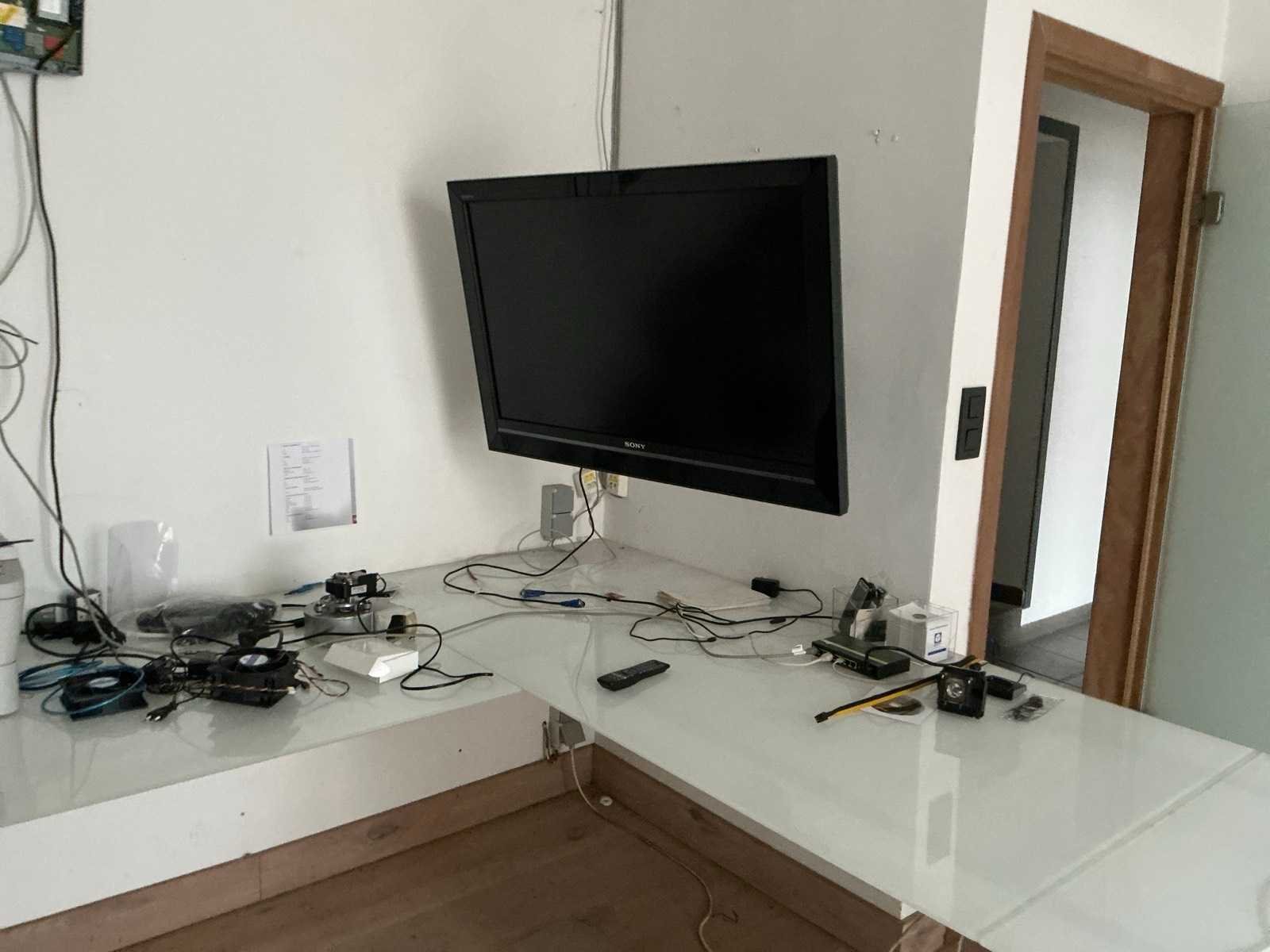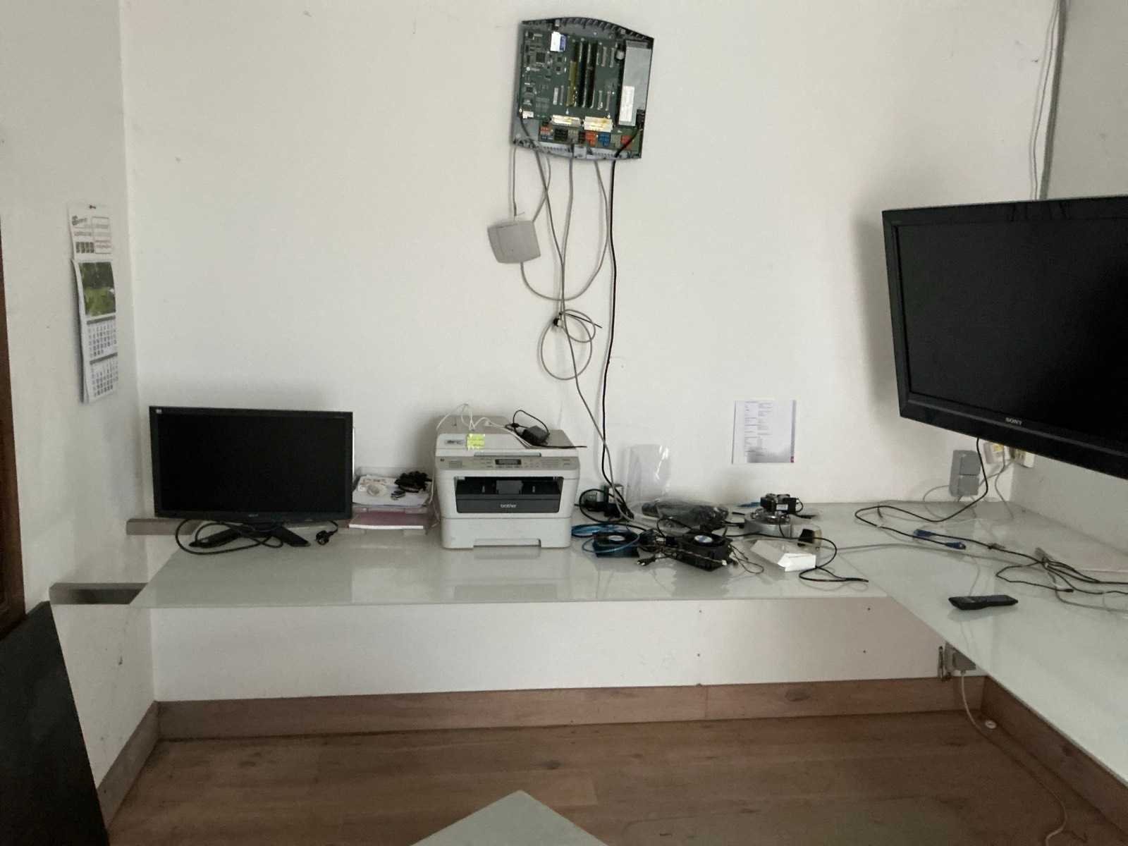 Bestaande uit: Metalen hoekbureau voorzien van glazen bovenblad, afmeting: 315x266x77cm, TV Sony 102” voorzien van muurbeugel en afstandsbediening, printer Brother MFC 7360, 2 diverse monitors, zekeringkast Legrand en enige kantoorartikelen zoals computeronderdelen, gelast frame en vast in muur
