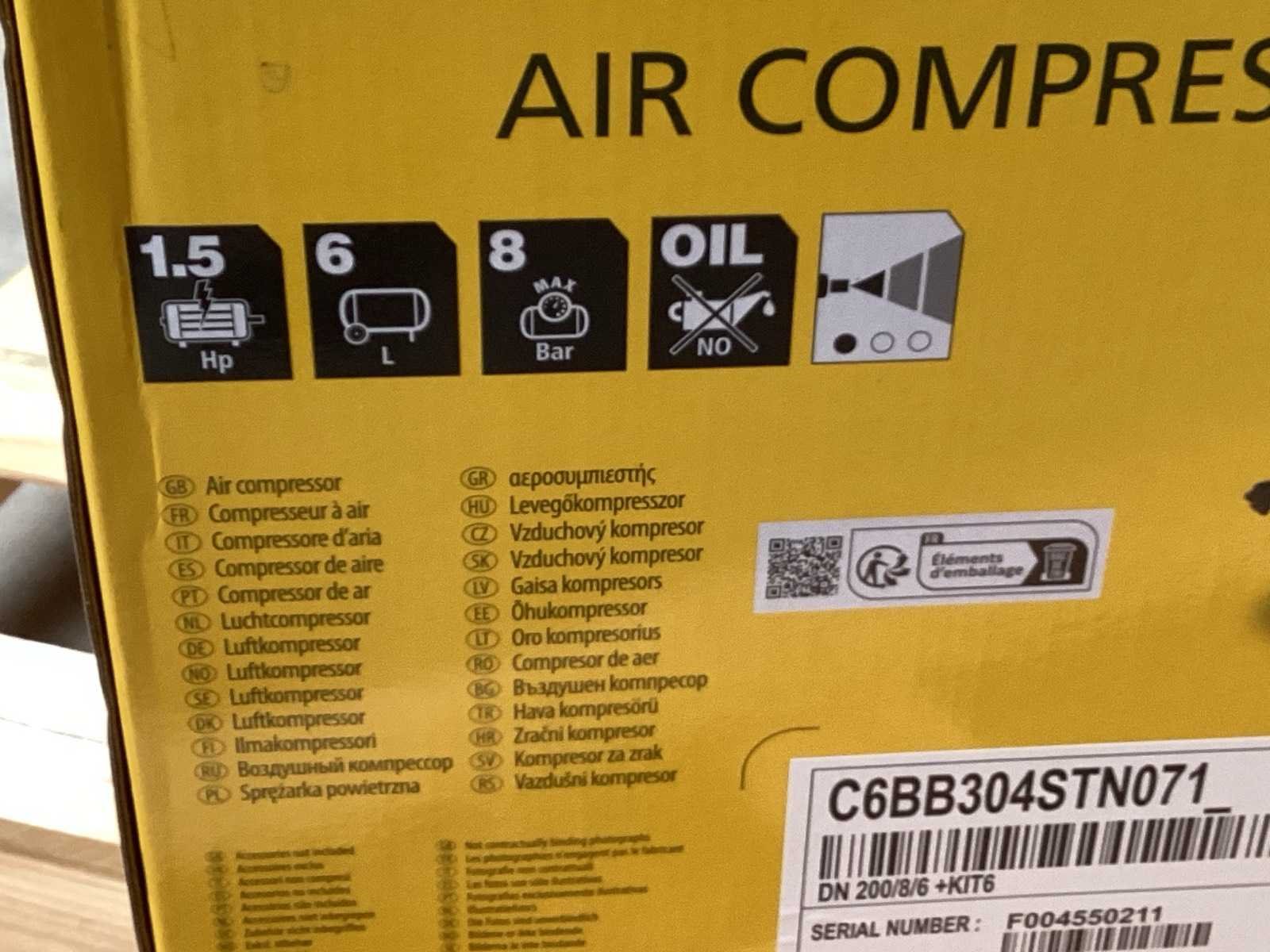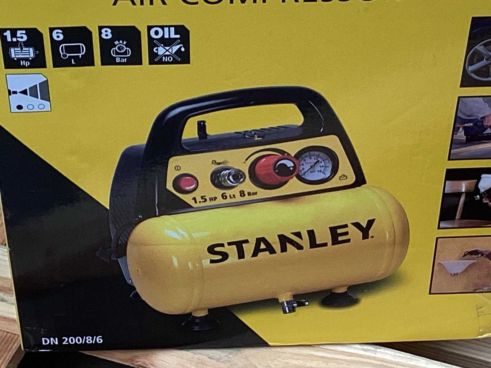 Mobiele compressor 1,5 pk, draagbaar Merk: Stanley Type: D200/8/6 Mobiel: true Capaciteit.: 8bar Buffertank inhoud: 6l Aansluiting: 230V