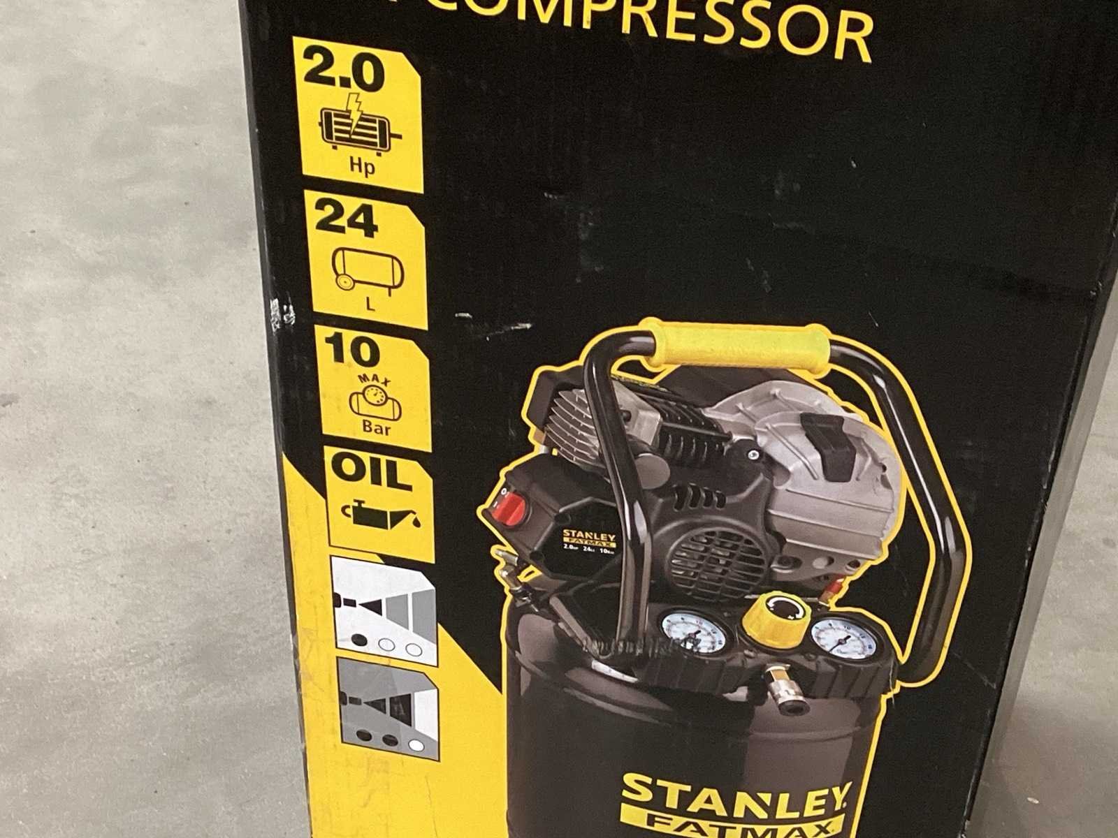 Compressor 2 pk, 10 bar, 24 liter, oliegevuld Merk: Stanley Fatmax Type: FMXCM0045E Capaciteit.: 10bar Buffertank inhoud: 24l