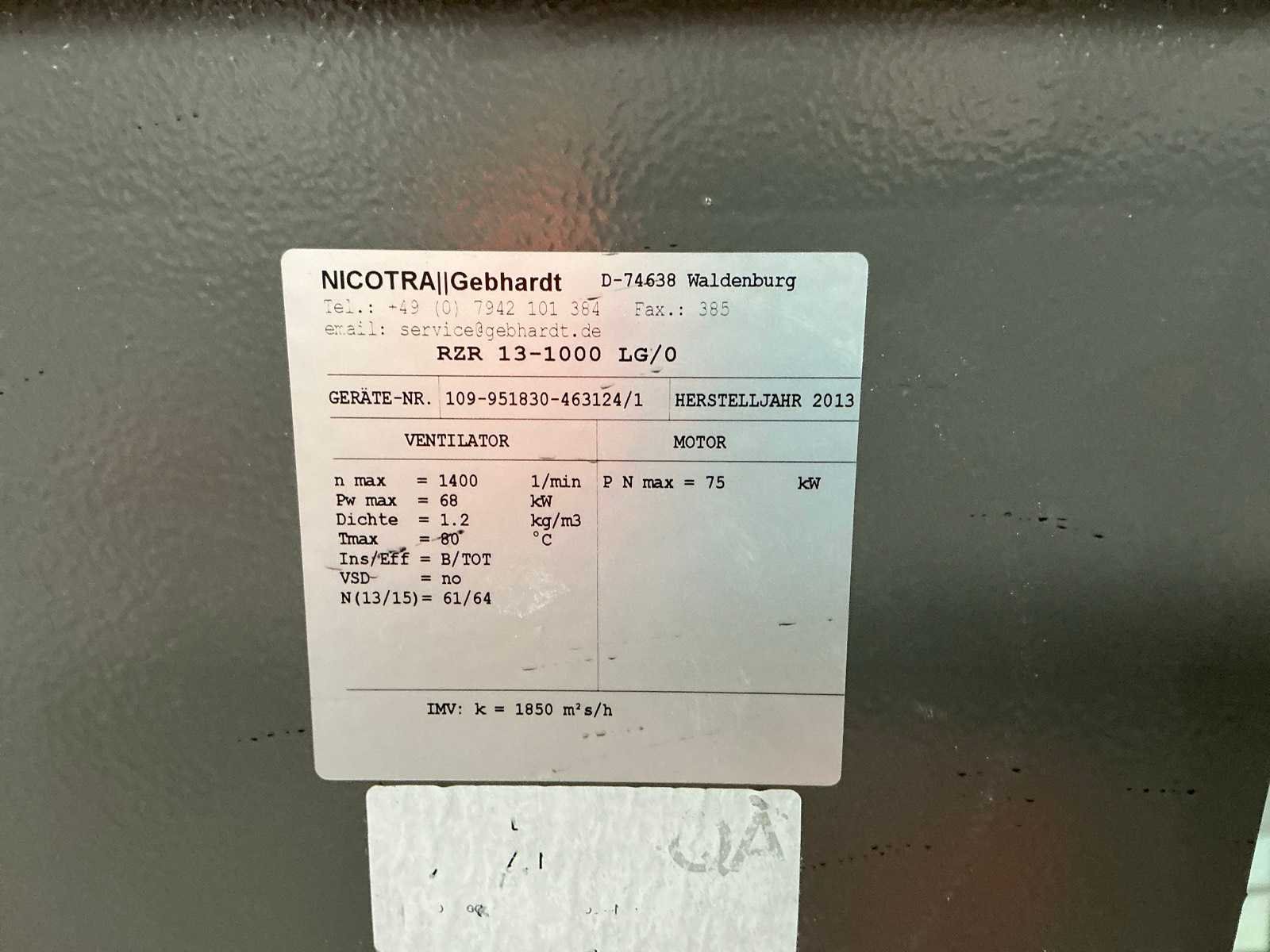 <Br> - Max. toerental: 1400 t/m. - Max. ventilatorvermogen (Pw): 68 kW. - Afmeting: circa 180x190xH195cm. - Met Hoyer elektromotor vermogen 11kW. Merk: Nicotra Gebhardt Type: RZR 13-1000 LG/0