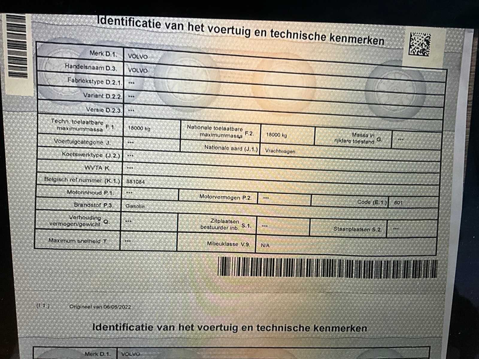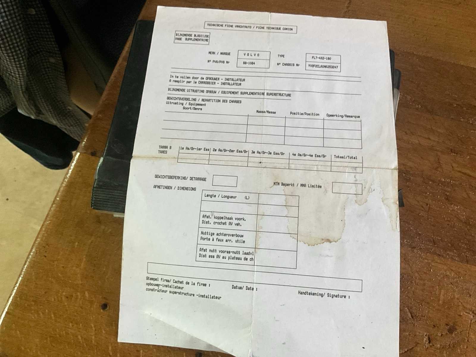 Aanwezige boorddocumenten: inschrijvingsbewijs deel I en II, technische fiche Merk: Volvo Type: FL7 Bouwjaar: 1991 Chassisnummer VIN: YV2F2CLAXMA353247 Datum eerste toelating: 7/1/1991 Type transmissie: Handmatig Aantal assen: 2 Fuel Type: Diesel Aantal sleutels: 2 Slaapcabine: true Startinformatie: Start mits boosten Afgelezen kilometerstand: 1046241km Aantal zitplaatsen: 2 Diesel: true